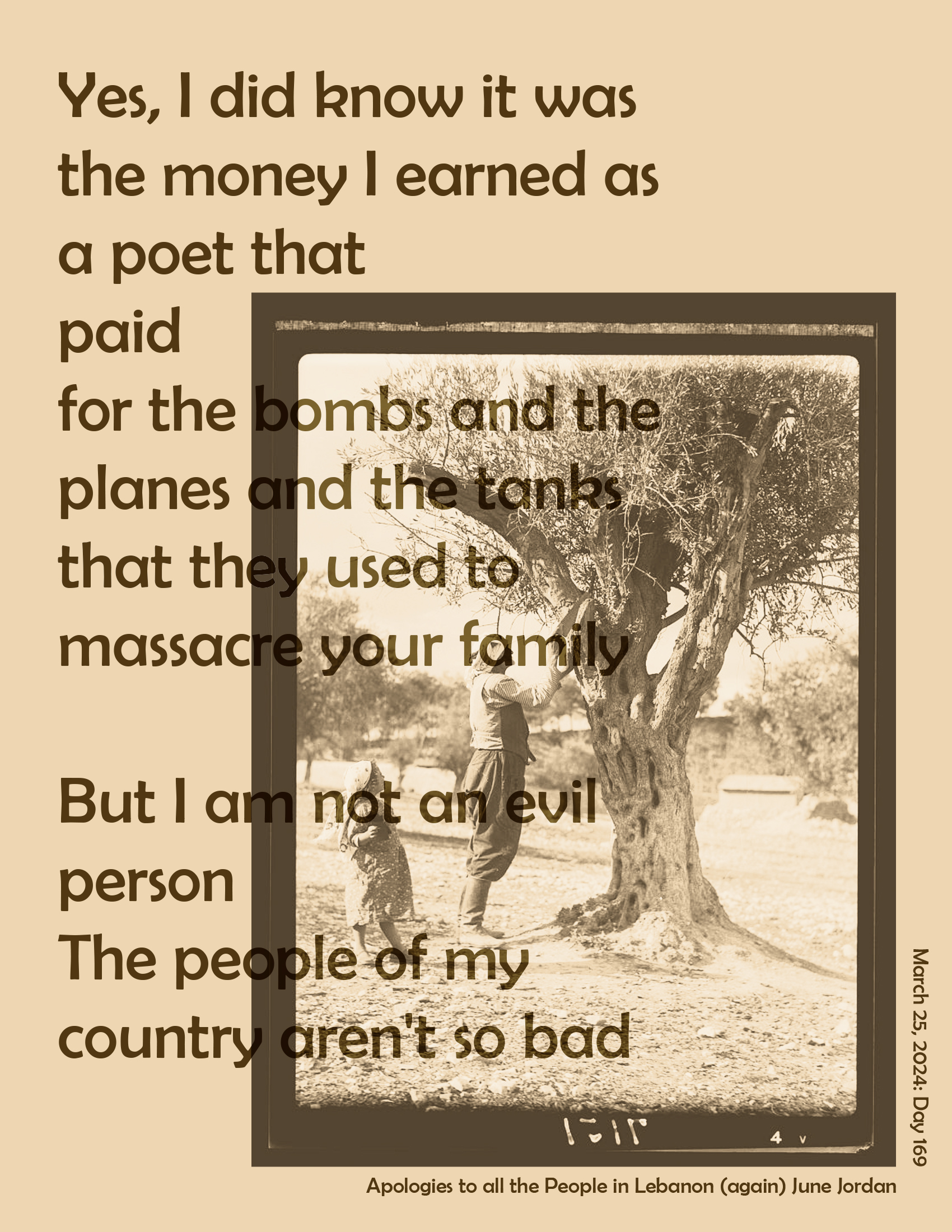 “Apologies to all the People in Lebanon (again), June Jordan, March 25, 2024: Day 169.” Poster courtesy of secret poster club.