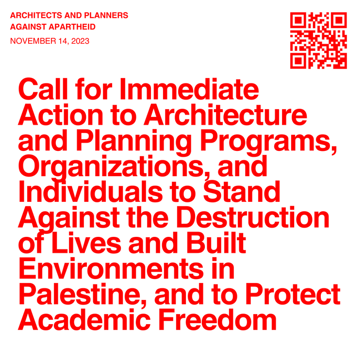 Social media statement from November 14, 2023 calling for action from architecture and planning programs against destruction in Palestine and for the protection of academic freedom. Courtesy of Architects and Planners Against Apartheid.