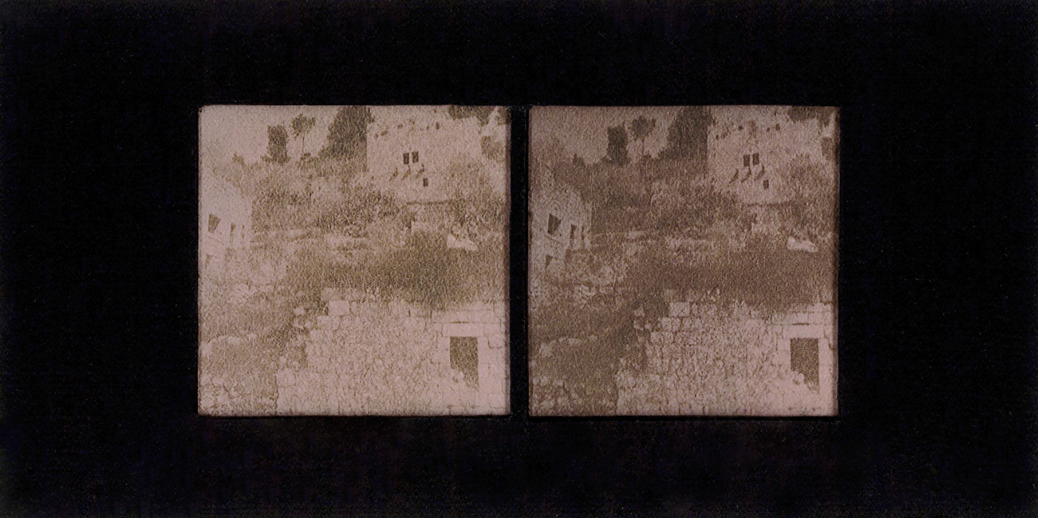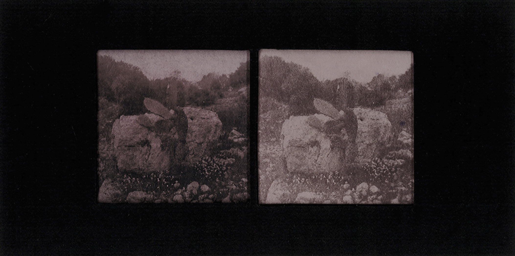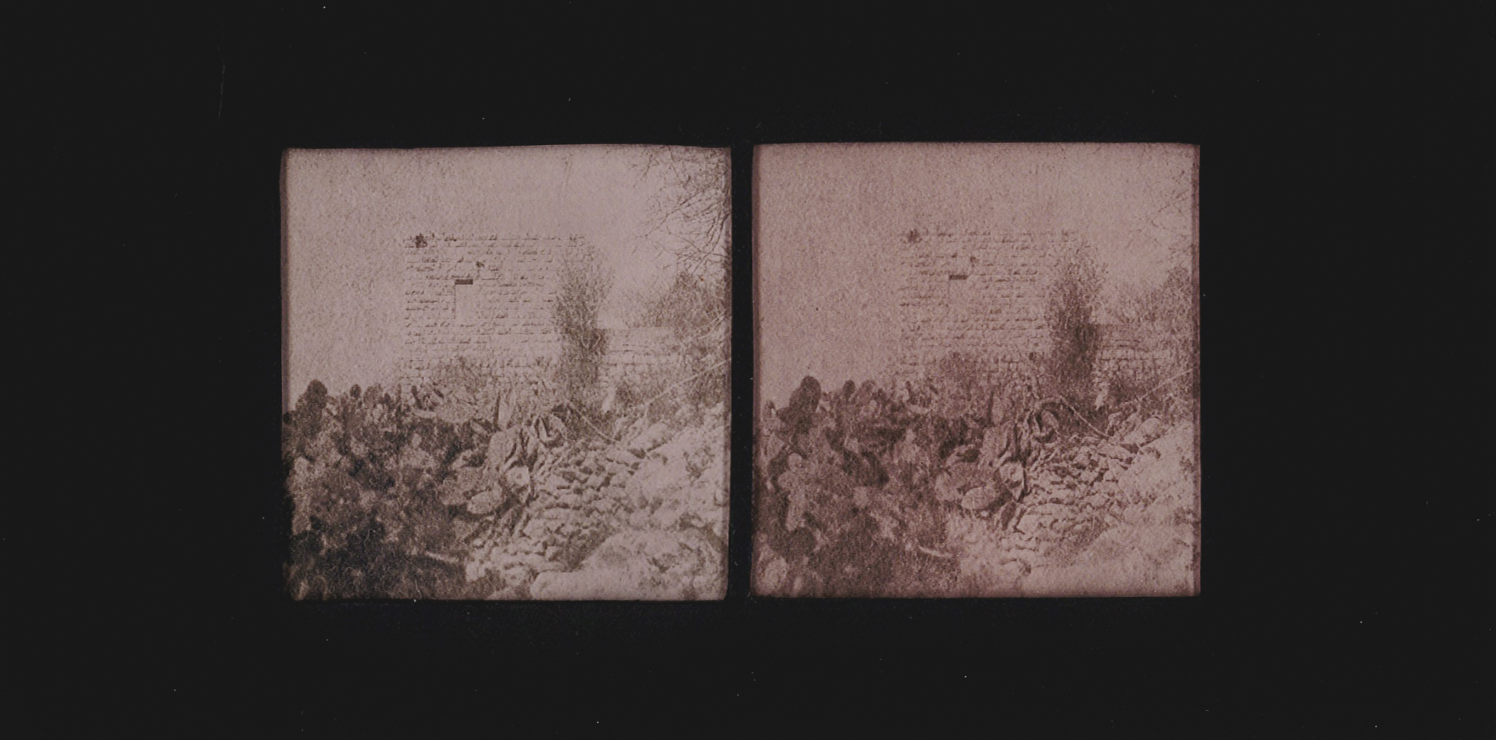 Many of the photographs in this essay were produced during our fieldwork in Palestine in 2023. They depict intimate encounters with cacti across sites of villages destroyed and depopulated in 1948 to contemporary farms and urban spaces in the West Bank. Printed with cochineal that populates these sites, these stereoscopes reference a nineteenth-century image-making technique that creates a three-dimensional effect when looking through the stereoscopic viewfinder. By placing two skewed images of the same scene side by side, the brain fuses the images together, creating a sense of depth and distance, tricking the viewer into an illusion of reality.11