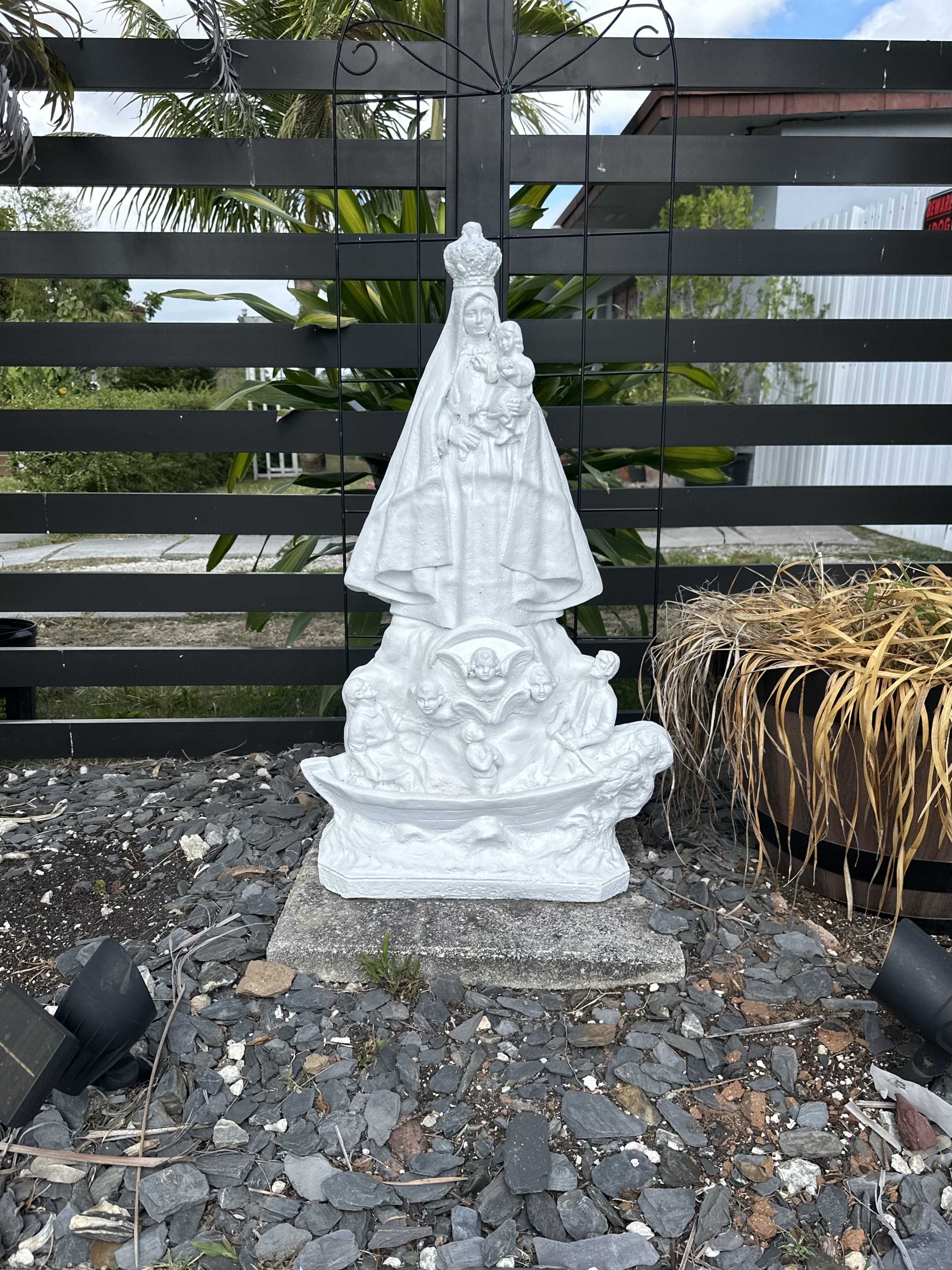 Religious syncretism has thrived in the Caribbean because of the many parallels between African and Taíno gods and goddesses and Catholic saints. It functions subversively: strategically veiling existing social structures or previous religious beliefs under the appearance of orthodox religion. African and Taíno deities had biblical counterparts in European Roman Catholicism that allowed for swift “adoption” of the orthodox religion. For example, figures like La Virgen de la Caridad del Cobre were surrogates for the Yoruba Oshun, the goddess of beauty, sensuality, and fertility. La Virgen was probably my grandmother’s favorite saint, as she was the patroness of Cuba and had political symbolism. She appears throughout Miami’s domestic and urban realm, at different scales: she is nested in altars in our mothers’ gardens, adorns wine glasses in our kitchen cabinets, and sits on top of our dressers enshrined in gold. This African and Indigenous fungibility can be traced in the imagery of La Virgen. For instance, the upside-down crescent that she stands on in Cuban iconography is derived from crescents in Taíno culture. In a journal entry from 1496, Columbus documents a Taíno man wearing “a half-moon of guany [guanín] and another half-moon of twisted hair and certain small pieces of brass tied together” through the lower part of his nose. The Taínos saw the crescent as a rainbow, associated with their feminine spirit, Guabonito, manifested by the union of sun and rain. Guabonito had an inaccessible sexuality and was linked to healing rites and purgation. The African appeal was her parallels to the Yoruba goddess Oshun, who was often represented in gold and with cowrie shells, thought to have been conjured in water.9 Her image was discovered in 1612 in Nipe Bay by three enslaved boys known as “los tres Juanes,” in which she holds baby Jesus. They took her wet wooden effigy into the town near the copper mines, hence the name El Cobre. In Cuban collective memory, La Virgen is the patron saint who watches over migrants traveling at sea. Her image was used as a historical symbol in the Independence War of 1895 and the Ten-Year War of 1868–1878, which drew in guerrilla warriors from all statuses and was integral in freeing slaves in Cuba. Cuba would not gain independence until 1902.