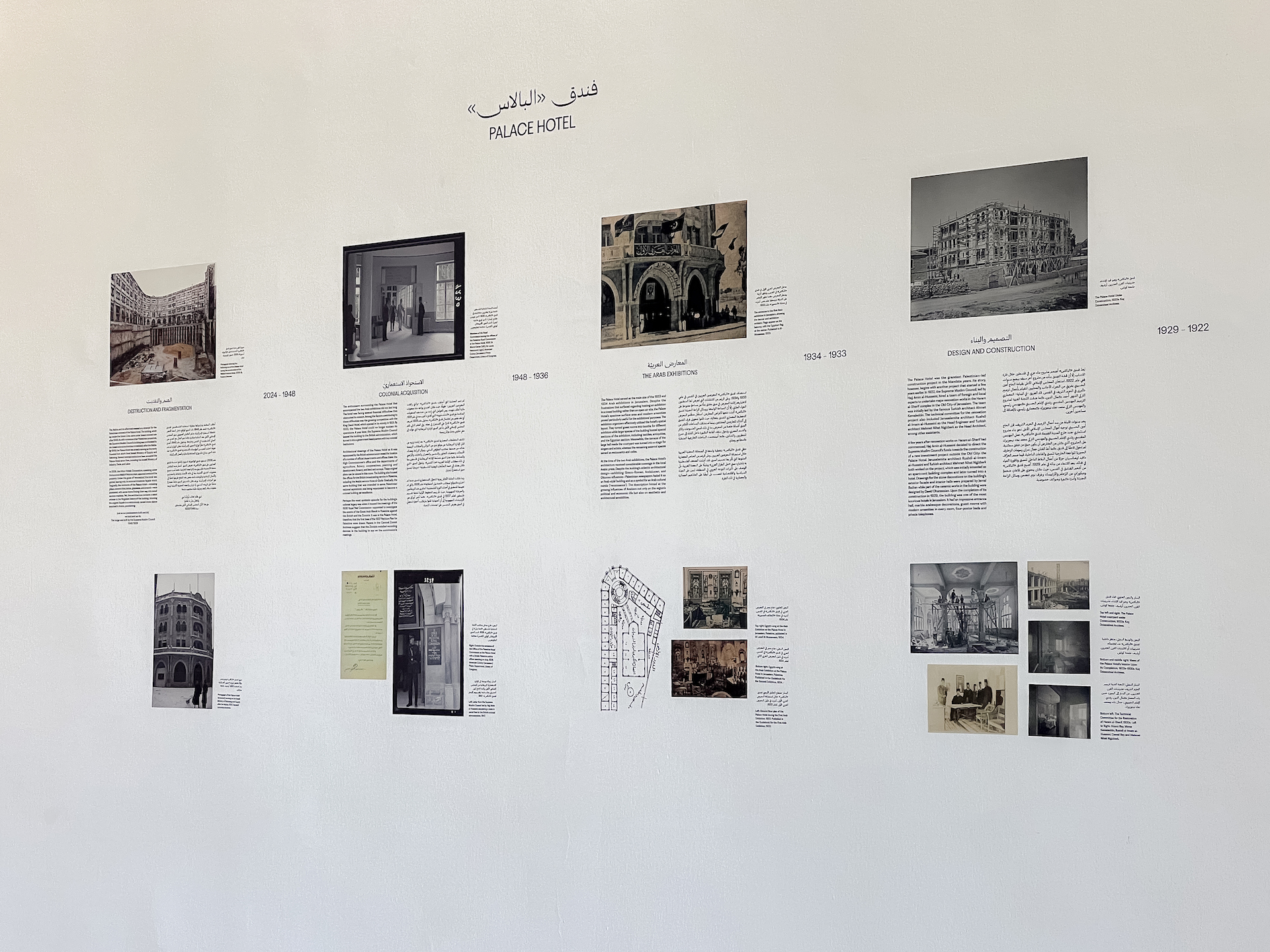 These networks are reflected in the layout of the exhibition. One side foregrounds politicians, business owners, merchants, bankers, journalists, and intellectuals. Through texts and archival material detailing the exhibitions’ planning, public reception, and media coverage, it speaks to the social formation of Palestinian elites during the Mandate period and how they negotiated the organization of the exhibitions. Another corner is focused on architects and engineers through a comprehensive biography of the Palace Hotel. This display pays tribute to Rushdi al-Imam al-Husseini, the head of the Technical Committee responsible for constructing the hotel, and highlights his social role in the Association of Arab Engineers, established in 1936, two years after the Second Arab Exhibition.19