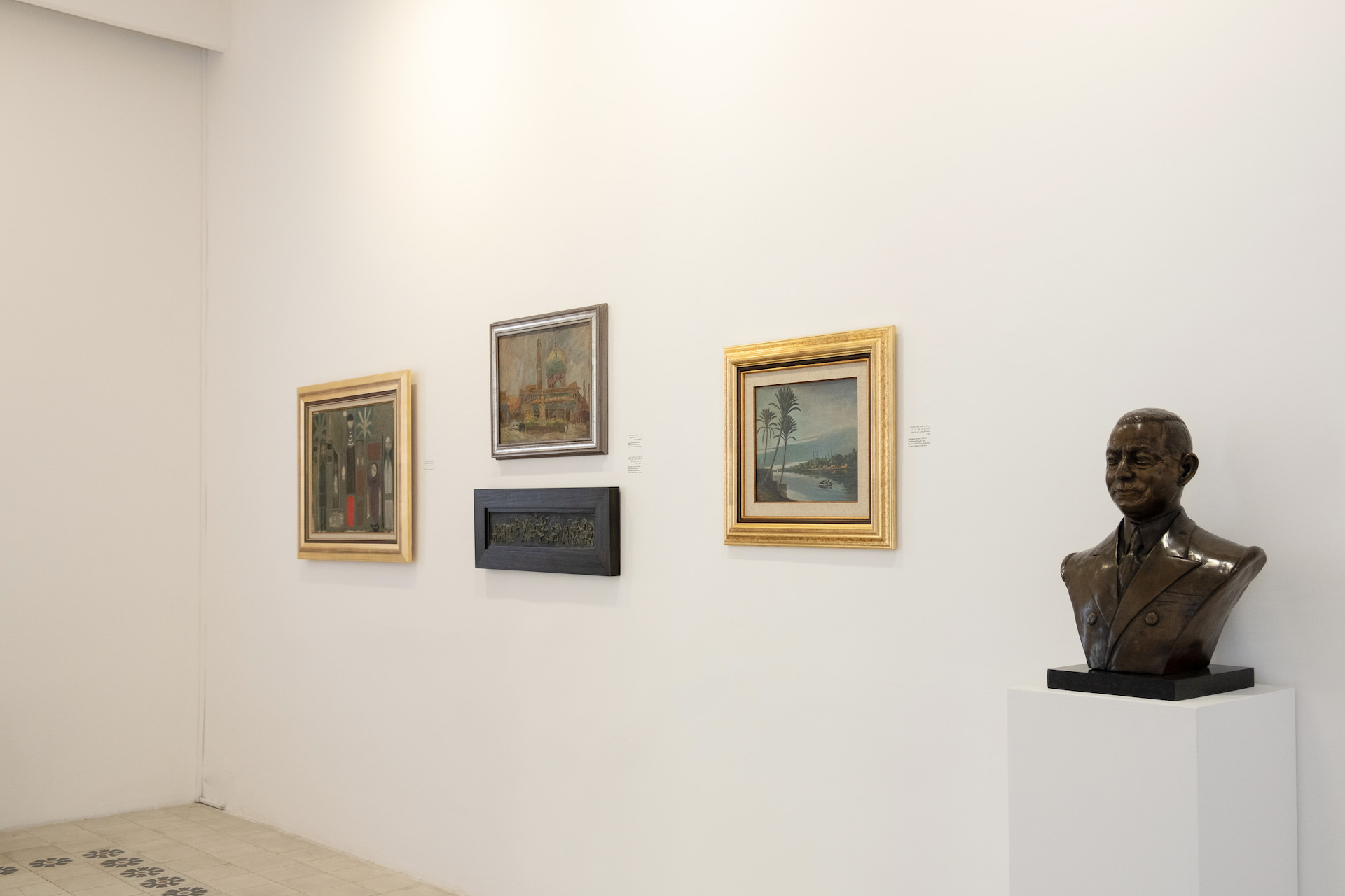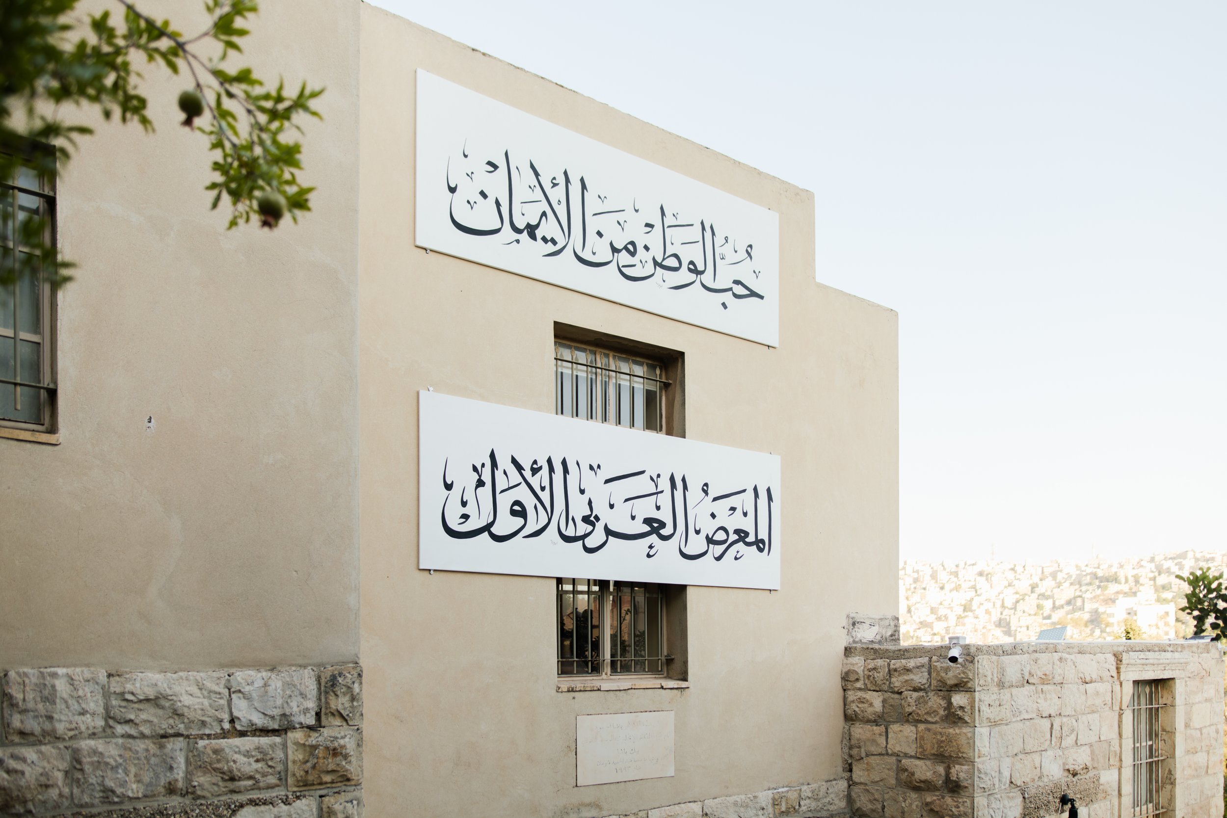 Similarly, the works of artists, iconographers, artisans, calligraphers, and designers are highlighted throughout the exhibition space, with one corner displaying the works of Iraqi artists who took part in the 1932 Baghdad Agricultural and Industrial Exhibition that hugely influenced the Jerusalem exhibitions. Among them is sculptor Fathi Safwat, whose works were exhibited in the First Arab Exhibition in 1933. References to the Nahda are tactfully placed outside the exhibition space, facing the city of Amman. Approaching Darat al Funun’s entrance, visitors are welcomed with calligraphy on the building’s façade that reads: “Love of one’s homeland is part of faith.” This phrase, which was the motto of Al-Jinan, a magazine founded by the prominent Lebanese Nahda intellectual Butrus Al-Bustani in the 1870s, was first calligraphed on a banner dropped from one of the balconies of the Palace Hotel during the Second Arab Exhibition in 1934.