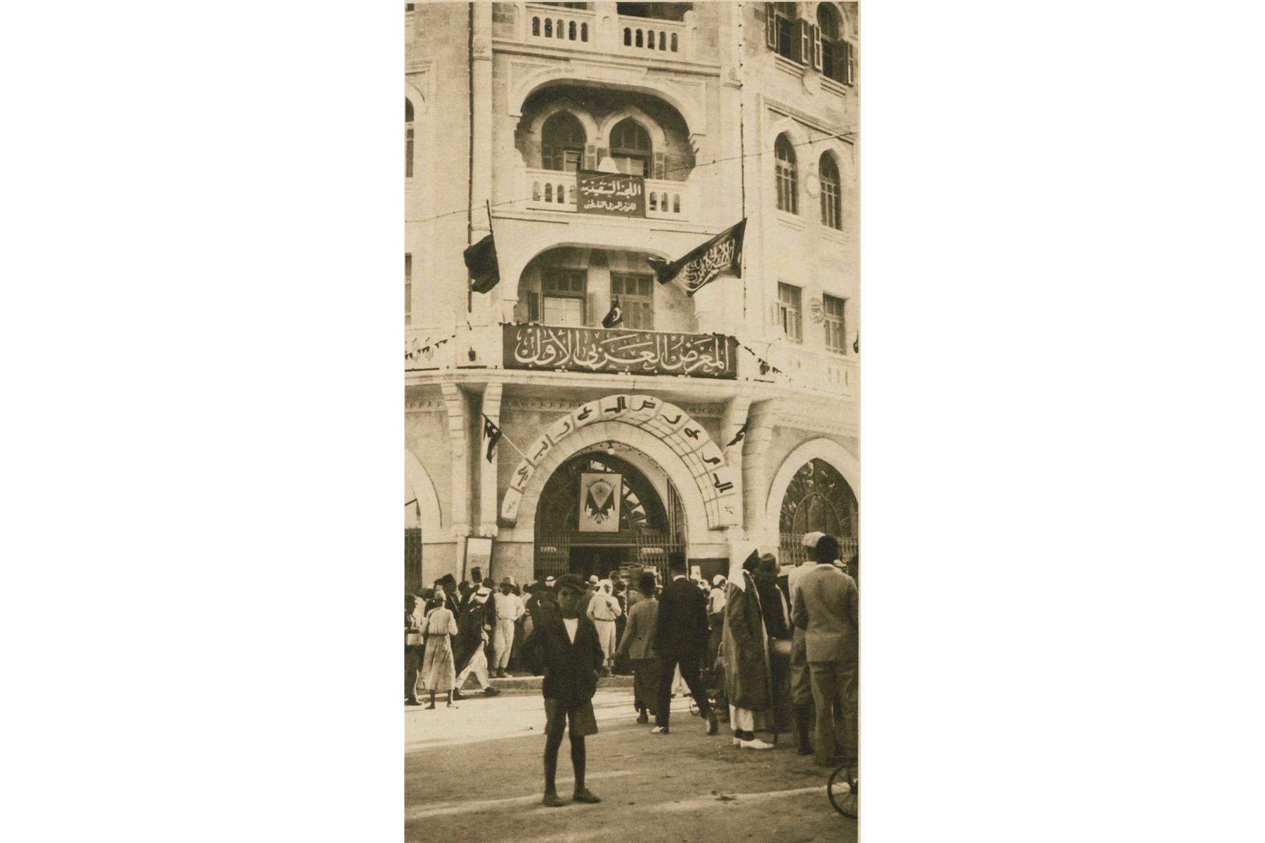 In July 1933, a large crowd from all over Palestine and even some neighboring Arab cities, gathered in Jerusalem in front of the Palace Hotel to attend the First Arab Exhibition. The exhibition—along with its second installment in 1934—sought to showcase and promote the latest Arab innovations, industries, products, crafts, and arts. Walking through the hallways of the Palace Hotel and into its rooms—which were repurposed as exhibition spaces—one would have found chocolate from Beirut, cigarettes from Haifa or Latakia, fragrances from Tripoli, soap from Nablus, blankets from Baghdad, leather works from Aleppo, carpets from Cairo, silk and cotton fabrics and garments from Damascus, Tatreez embroidery, and mother of pearl pieces from Bethlehem, as well as many other products from the Arab world, like oil paintings, metal works, furniture, and medicine. If visitors got tired walking around the exhibition halls, they could rest in the building’s garden cafe or attend a cinema screening or music performance in its theater on the upper floor. The Palace Hotel was not only the site where the exhibitions took place; it was itself on display in a way. Built in 1929 by the Supreme Muslim Council, it was a sign of Palestine’s modernity, and itself was one of the local innovations the Arab Exhibitions sought to celebrate.
