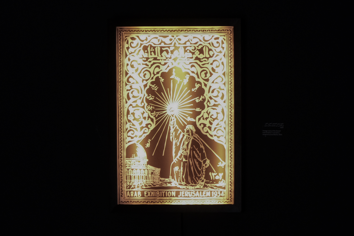 The first thing one sees as they enter the main exhibition hall at Resurgent Nahda—even before seeing the exhibition wall text—is a historical timeline that places the Arab Exhibitions between two key revolutionary moments in Palestine: the 1929 Buraq Revolt and the 1936 Great Revolt. The timeline highlights key moments in the organization of the Jerusalem exhibitions and situates them in relation to three other regional and colonial exhibitions: the 1931 Paris Colonial Exposition, the 1932 Baghdad Agricultural and Industrial Exhibition, and the 1932 Levant Fair in Tel Aviv. Abusaada presents these three exhibitions and how they influenced the Jerusalem exhibitions from the point of view of Issa al-Issa, a prominent Palestinian intellectual and journalist and the main figure behind the conceptualization of the Arab Exhibitions. The timeline quotes from al-Issa’s memoirs: “It was [during my visit to the Paris Colonial Exposition]… that my idea of holding an Arab exhibition in Palestine crystallized.”20