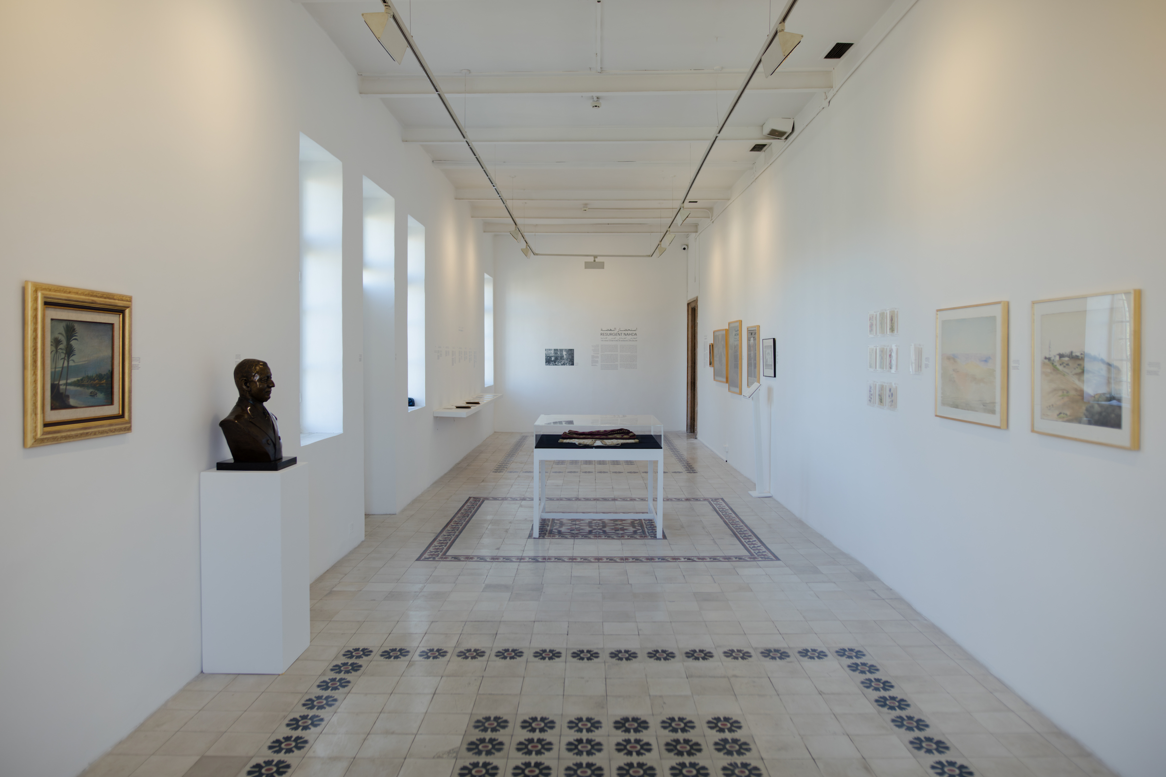 Resurgent Nahda consists of three main sections. The first lays out the historical context in which these events were organized, asking: How did they come to be? Who was behind them? How were they influenced by other regional and international exhibitions? And where do they fit within the bigger picture of the Palestinian national movement and struggle during the British Mandate? The second is dedicated to the artists, artisans, and craftspeople whose work was featured in the Arab Exhibitions, showing paintings by Nicola Saig, Zulfa Al-Sa’di, Khalil Halaby, and Sophie Halaby; glass vases and illustrations by Jamal Badran, who is credited in the wall text as the chief illustrator for the exhibitions; embroidery pieces by Nijmeh Kharoufeh and Mary and Jamila Salman; and mother of pearl works by Yousef al-Zughbi. The third section focuses on the architectural fabric of Mandate Jerusalem. It shows the blueprints of the Palace Hotel and outlines the tragic post-history of the building.