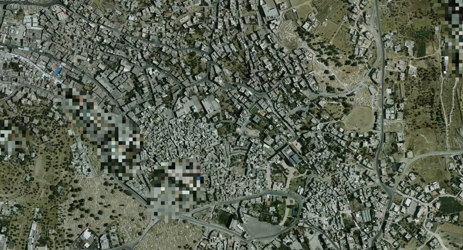 Looking at commercially available aerial maps, we see and unsee. In 2019, I acquired a high-resolution satellite image from the HRC, where details of the old city are generally clearly presented; however, some locations remain pixelated and indistinct. According to a GIS expert from another Palestinian organization (who has asked to remain anonymous), Palestinians are only allowed to take aerial photographs of the West Bank after acquiring a permit from the Israeli state, which is rarely given. Most Palestinian aerial maps that Palestinian organizations use are, therefore, bought from Israeli private imaging companies that only sell images that have been censored wherever an Israeli “security concern” may exist, such as Israeli occupation military posts and Israeli settlements in Hebron.31 The pixelated fragment is yet another example of the occupation’s attempts to obscure and eliminate. The pixel, generated by a single click on a computer, erases thousands of years of history, heritage buildings, families, and kinships.