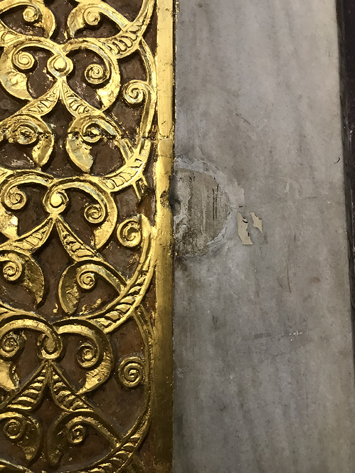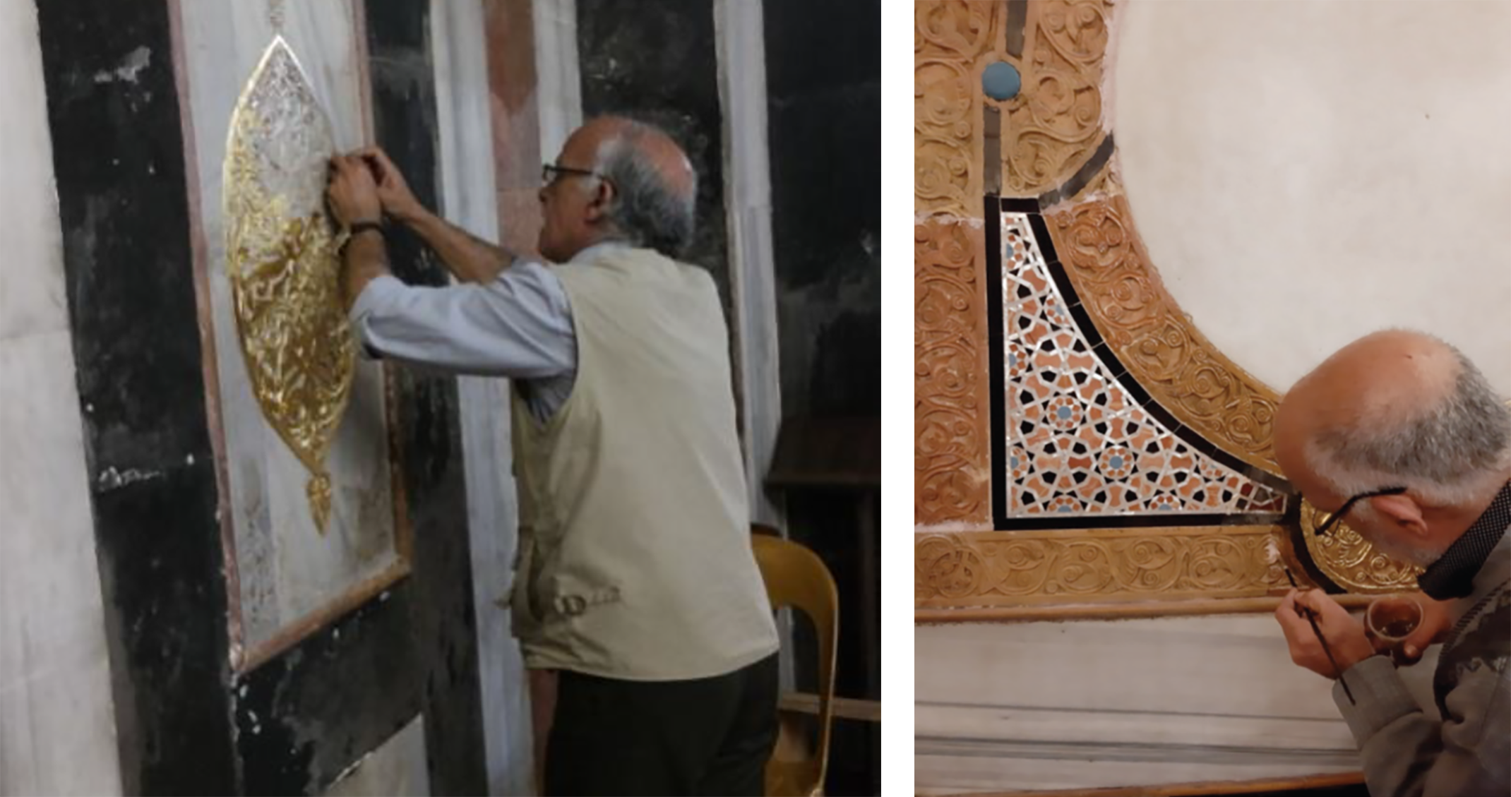Next to one of the patched bullet holes is an ornamental detail that the HRC meticulously regilded. Nuha, the architect responsible for evaluating the work, and Khaled, the supervising technician responsible for the renovations, discussed the regilding process with me, wondering if the color matched the original intentions. The HRC had extensively researched the regilding process to maintain the site’s authenticity and to comply with heritage conservation best practices. Standing beside this patchwork, we discussed the challenging circumstances imposed by IOF restrictions and their impact on the maintenance work.
