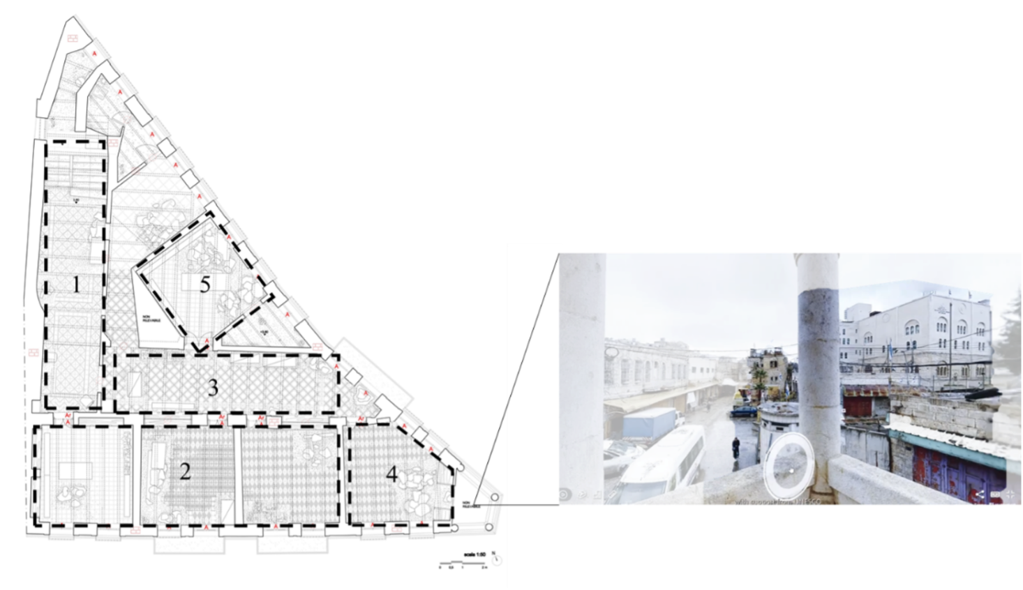 Located on the second floor of the building, the museum is organized into five spaces that trace Hebron’s history, architecture, and cultural heritage.37 Together, they present the city’s historical timeline, the Ibrahimi Mosque, HRC’s rehabilitation efforts, the political realities of occupation, and traditional crafts through a collection of artifacts. Most noteworthy is the fourth room, which features the only balcony in the building. As visitors enter the room, they encounter photographs, maps, and texts that illustrate the Israeli colonial project in the old city. Looking out from the balcony, visitors are confronted with this colonial reality in its material, tangible form, all obstruction or abstraction removed. The balcony offers a view of the Beit Romano settlement, which hides behind a barbed wire wall. The view exposes sections of the pixelated aerial map, framing an elevated view of the illegal settlement. This view collapses the distance between narrative and lived reality, insisting on material grounding. Jack Persekian, who originally curated the museum, notes: