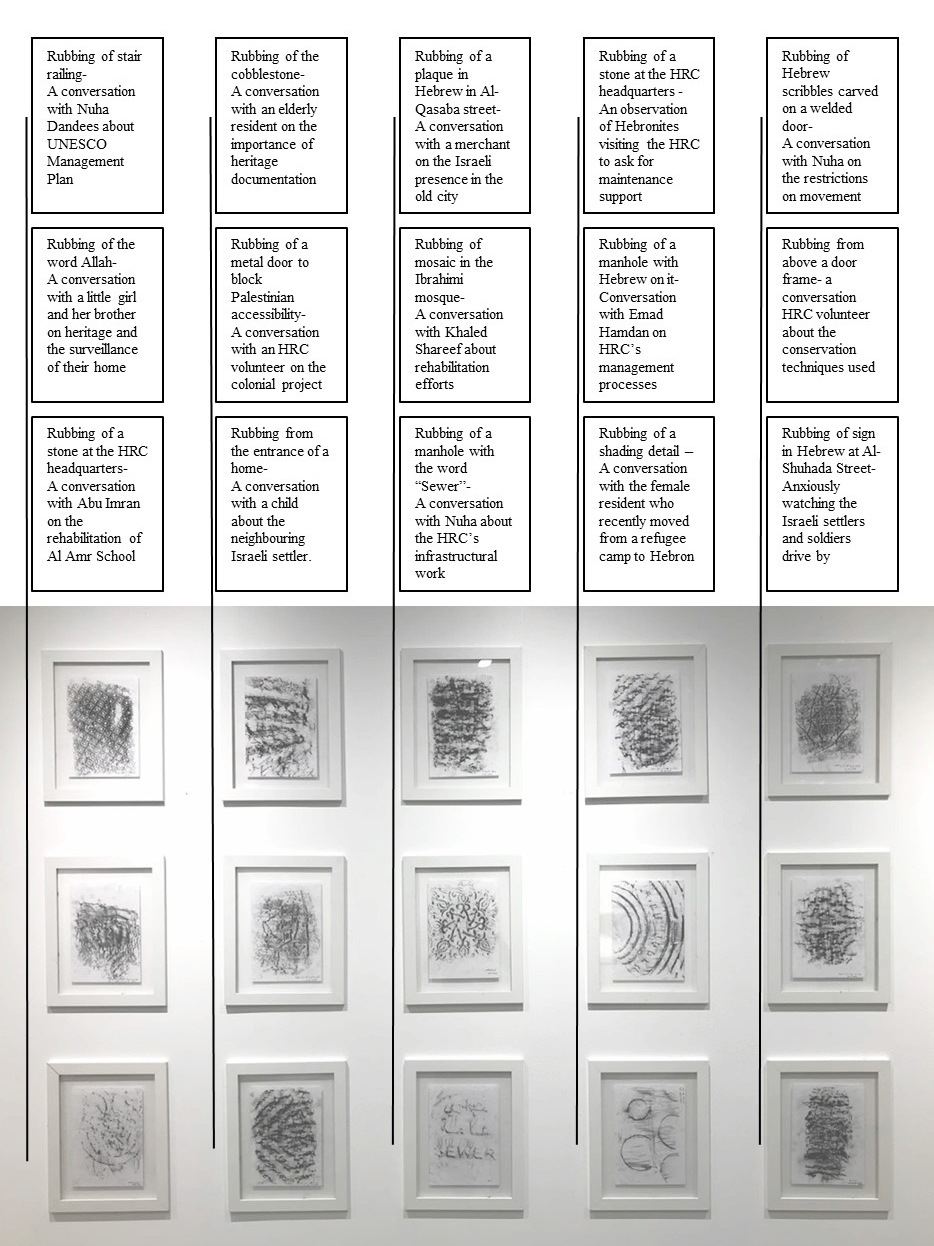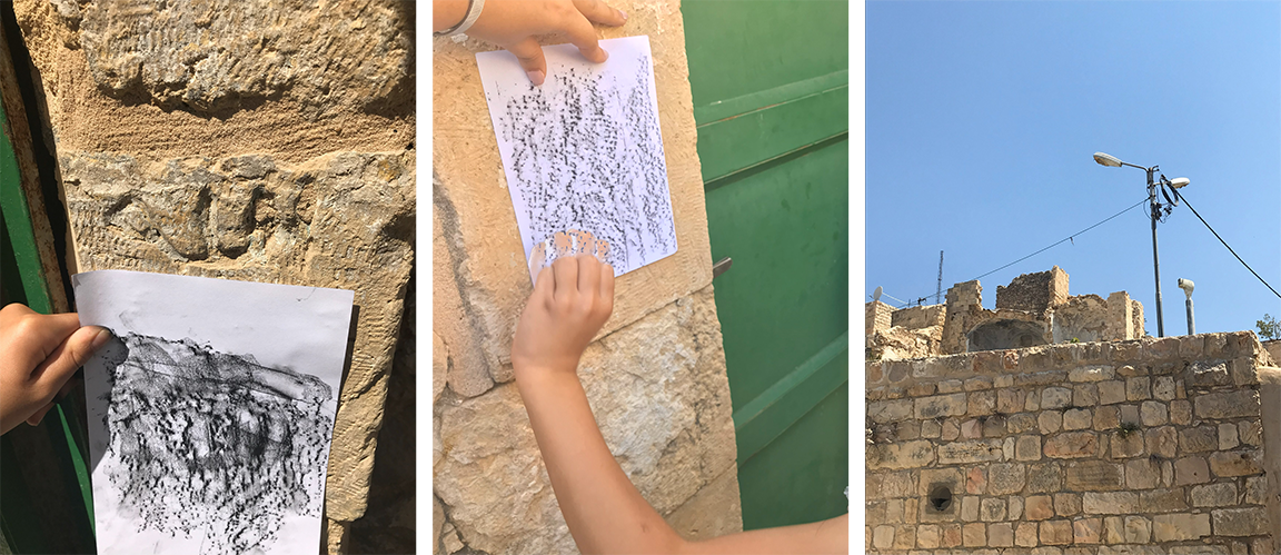 Throughout my volunteer time, I felt compelled to document these architectural details, urban surfaces, and textures through charcoal frottage rubbings as a way to ground Palestinian presence in tactile truth.22 Rubbings are intimate and slow acts—the charcoal dust on the fingers, the imprint on the paper, the pressure on the wall. The rubbings were also a method into the city and the community. As I knelt on the floor, residents showed curiosity in what I, a Palestinian woman, was doing in this unusual public practice. In one incident, during my field survey visits with the HRC, we came to a house near Al-Haram, an area accessible to Palestinians only on foot. As we surveyed the home’s historical elements and structural condition, I took a few rubbings of the details. The word “Allah” was inscribed on a door’s stone frame. I began to place the paper on it, only to be interrupted by a girl from the family, no more than ten years old, who asked to make the rubbing.