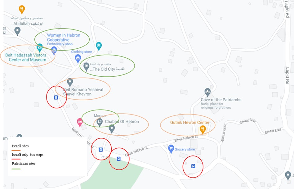 The erasure extends beyond resolution. It is further amplified by manufacturing alternative realities within the blur. When looking at a Google Maps image of the old city of Hebron, you are fed an Israeli narrative of the city with limited Palestinian presence. Google’s orienting landmarks are preestablished, pinned locations of primarily Israeli tourist sites (marked in orange). These instances of cartographic hasbara reproduce an Israeli narrative of Hebron’s past and present through linked websites that frame Hebron as a terror-ridden area, full of conflict and danger. Al-Shuhada Street, the original main artery of the old city, once bustling with noise, shops, textiles, and people, and the original site of HRC headquarters, is relabeled as David HaMelech Street.27 The historian Patrick Wolfe frames these patterns of erasure and reorientation in settler colonial contexts as a destroy in order to replace paradigm.28 Today, as I saw and was not permitted to see, the street is now a ghost town that is inaccessible to Palestinians. The bus stops on the street (marked in red) are inaccessible to Palestinians. The buildings in the street are in dire need of rehabilitation, and the courtyards are filled with waste. Now, the street is where Israeli settlers walk and drive through in cars with identifying yellow license plates, some of them armed.29
