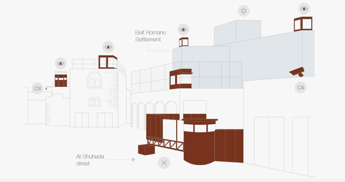 The building is located within Bab Al-Baladieh (Municipality Gate) Square, adjacent to the former municipal building. The square has historically been used as an important connector between Al-Shuhada Street and Al-Qasabah Street.36 Since Al-Shuhada Street has been off-limits to Palestinian residents, the area is now completely under the occupation’s surveillance and control. In the 3,000 square meters of Bab Al-Baladieh Square, there are six watchtowers (some located atop Palestinian homes), a metal gate that opens only for settlers, and several surveillance cameras, all managed by the IOF.