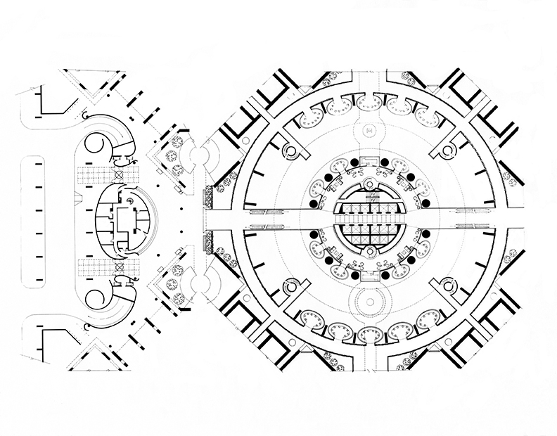 But this night I feel like collectivity is only one part of the atrium’s appeal. Chapter 4 of Rice’s book is titled, “The Geometry of Interior Urbanism.” It is filled with diagrams and useful spatial analyses, demonstrating how Portman’s projects, from his own home at Entelechy, Georgia, to the RenCen, deploy and juxtapose geometries to create urban spatial configurations. As an architect, I find this chapter incredibly useful. But it still doesn’t encapsulate the power of the place.