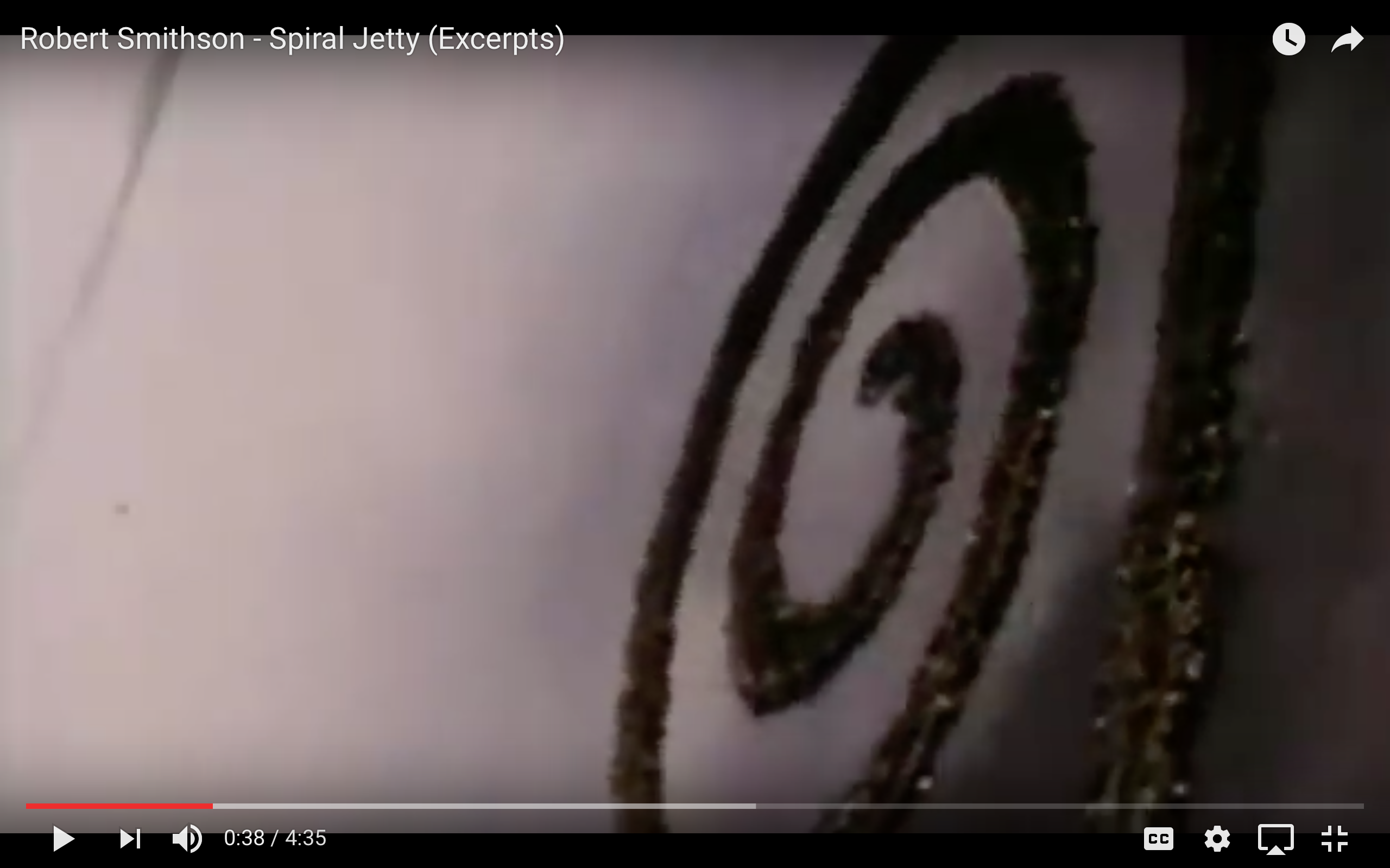 Smithson claimed he was not interested in large and aggressive interventions into a landscape but in “bringing a landscape with low profile up.” By standing at the end of the Jetty and looking out across the Great Salt Lake, his rather minor adjustments appear as major interventions even as they are dwarfed by a starkly sublime environment. Now over forty years old, it has begun to settle back into the salt plain, the mud and salt and rocks slowly shifting and blurring the once definitive boundaries between ground and that just above. The film, too, is a victim to celluloid decay, and of course, the effects of global climate change on the Jetty and other earthworks throughout the American West are as-of-yet unknown. Standing in stark contrast is the unrelenting digital memory of the Internet, where time can just as easily be played in reverse.