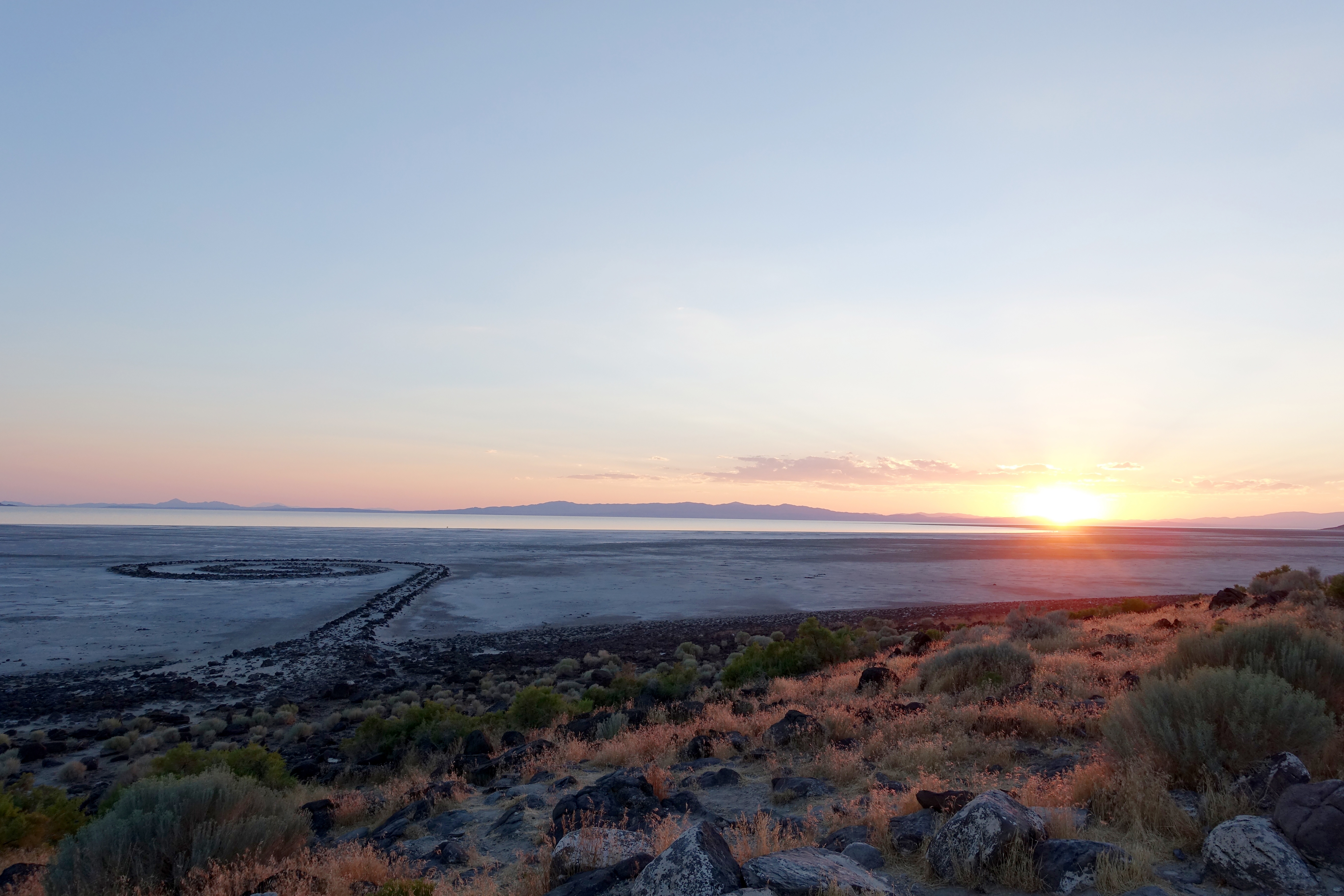 Directions to the Jetty are provided by the Dia Art Foundation website. The foundation acquired the work from Nancy Holt and the estate of Robert Smithson in 1999 and have managed it ever since, including the addition of a small commemorative plaque overlooking the earthwork and the installation of a campground for visitors wishing to stay the night. Dia’s directions are clear enough, and the route is well marked by signs, gently pulling you toward the Spiral as you travel through the desert. Included in the directions are notes about the “LAST GAS STATION” in Corinne Utah, 41 miles to the east, and the “LAST BATHROOMS” and “LAST CELL RECEPTION” at the Golden Spike Historic Site, a small yet well-staffed national monument commemorating the exact location where the east- and west-coast railroad lines were hammered together with a solid gold railroad spike.1