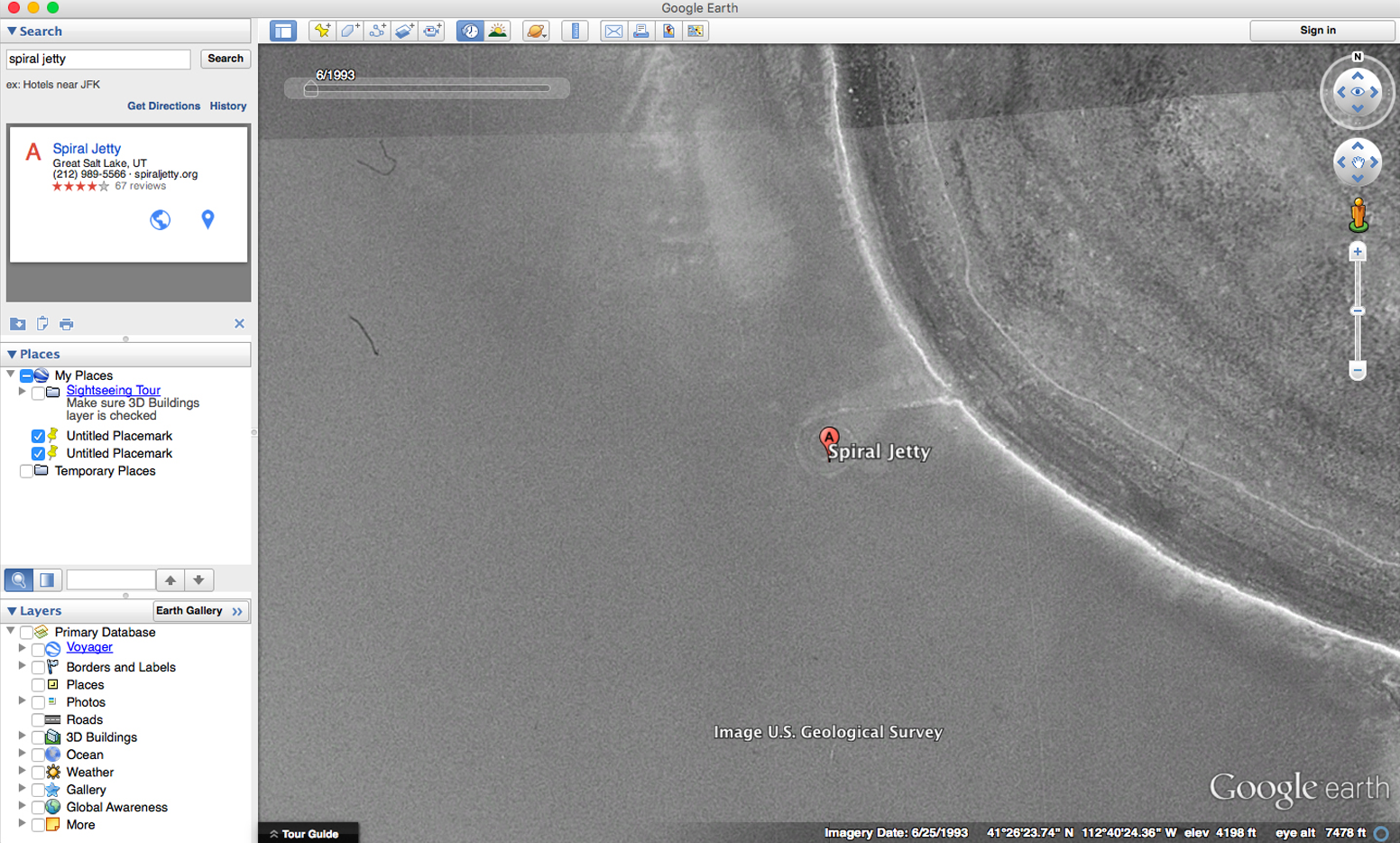It is easy to forget that the remote sensing technologies making consumer satellite images so pervasive have only been in widespread use for twenty-five years. Lisa Parks notes that the first time a satellite image aired on television was in 1989 when ABC News broadcast an aerial image of a Libyan chemical factory.6 Since then, governments and private companies have launched dozens of satellites into orbit for surveillance, weather, telecommunications, and consumer applications. Google uses multiple sources—from the MODIS Satellite, put into orbit by NASA, to GeoEye and DigitalGlobe, both privately operated, to other sources such as balloons and kites—to stitch together its image of the earth.7 This allows Google to both update their applications in near real time and to maintain a robust archive of geospatial satellite images—a type of low-resolution photo record of the earth’s surface. Images for the Spiral Jetty go back to June 1993, when the Jetty appears to be submerged under saltwater, and Dia’s parking lot and campground have yet to be installed.