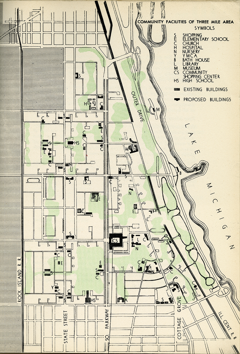 Each institution’s boards (the hospital, the university, the Chicago Housing Authority) were, like the South Side Planning Board itself, composed of different but overlapping constituencies. Each campus varied the building types on its land, lend-ing each the feel of a small city. Because none of the campuses was fenced, the entire seven-square-mile area had this same varied quality. Housing campuses combined townhouses, rowhouses, and slabs, ranging from seven to fourteen stories high, and included small community buildings. Institutions, whether the hospitals or the university, were collections of buildings. Landscape architects who collaborated on The Plan included Hideo Sasaki and Alfred Caldwell, among others. As with Frank Lloyd Wright’s Quarter Section scheme and the Burnham Plan, The Plan’s components—and each separate campus’s components—were connected by a fluid, landscaped system, including defined gardens, playgrounds, and green circulation arteries, and collecting the entire South Side Plan into a dynamic whole.