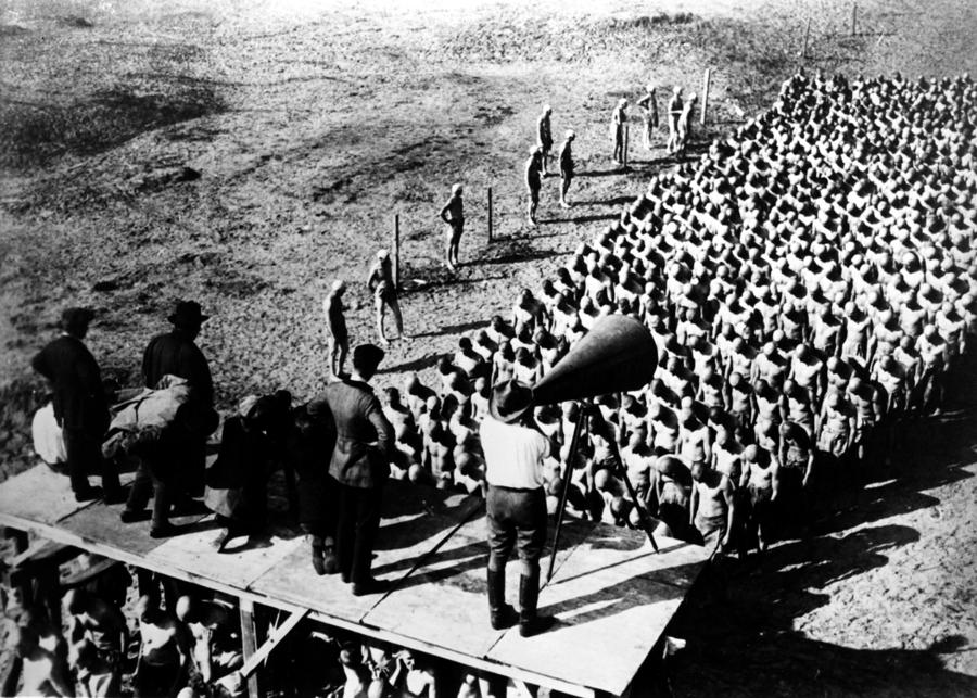 Readers may recognize what is happening in the image: Lang is atop a scaffold, directing the extras who will appear in the “Tower of Babel” scene. This scene occurs at a critical point in Metropolis, when Maria narrates to a group of workers the story of the Tower to emphasize the disunion between the head (the upper management of the film’s titular city) and the heart (the workers toiling underground). In this image from the making of Metropolis, the extras’ heads are bent, although it is not clear whether it is to shade their faces from the sweltering sun or if they are rehearsing. Similarly, Lang, flanked by film crew, in shirtsleeves with wide-brimmed hat, doing his best D.W. Griffith, yelling into a giant megaphone, appears not so much as a director, but rather as a high priest or overseer, telling the phalanx of shaven heads what they are supposed to be doing. This confusion between image and reality also applies to the Tower of Babel, which is to be read as the allegorical ancestor to the modern corporate skyscrapers appearing throughout Metropolis. It all points to the indelible comminglings of powers and institutions, of art and commerce, and to the deliberate framing and articulation of cinematic subjects.