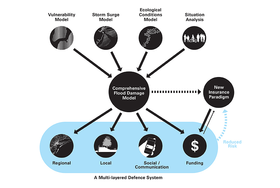 One of the key forms of design that has been embraced by RBD teams and is actively pursued by the organization as a whole, is so-called nature-based solutions—“sand engines” and oyster beds that can absorb storm surges, breakwaters modified to shield from flooding, water basins optimized to absorb floodwaters more efficiently, and so on. All these proposals constitute ways in which “nature” is incorporated into the design of the urban in ways that selectively cancel out (“naturally”) those of its more negative effects.17 Perhaps more fascinating than these design innovations is the fact that, unlike traditional modes of design, they all seem to require perpetual stewardship. Whether monitored centrally or through a more “bottom-up” engagement with community groups, nature-based solutions present themselves as eco-cybernetic technologies, at once using “nature” and its inherent processes, effects, and qualities in order to normalize the climate. Draped over with technologies of monitoring, “nature” becomes at once celebrated in its opposition to old-fashioned, man-made infrastructures, while at the same time it is transformed into a technology known through the copious data it produces. Indeed, nature-based solutions all seem to demand vast assortments of data-collecting technologies, sensors, and computational models, all of which are measured against “performance metrics” to present a real-time image of climate at the interface of land and ocean.18