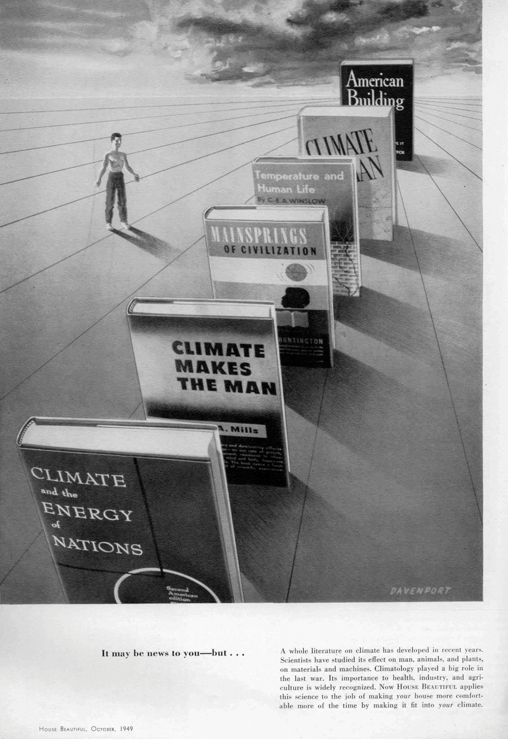 The ambitious Climate Control Project clarifies a few important aspects of the postwar interest in designing with climate: first of all, much of the discourse focused on methods that could produce a consistent, normative interior despite the vagaries of conditions outside. Second, it was conceptually framed through a premise of determinism. A stand-alone image in the first House Beautiful issue dedicated to the project played this out. It showed six books, arrayed across a lined landscape with clouds above, and a man, naked above the waist, looking at them.19 Most of the illustrated texts fell squarely in the historical narrative of climatic determinism, claiming that cultures developing in temperate climates benefited from their geographic conditions in the formation of knowledge and civilized social practices. Other cultures, it followed, especially those in the tropics, were seen to develop more slowly and less completely. Ellsworth Huntington’s Mainsprings of Civilization (1945), a follow-up to his Civilization and Climate (1915) and The Red Man’s Continent (1927), was in the image and is emblematic here. Huntington saw climate as a sort of filter to assist the process of evolution, with Europeans and Americans made more favorable for selection. Other texts argued similar theses on social and political, rather than biological, terms, and a much smaller group examined how these broader climatic patterns resonated in building practices. Fitch’s American Building, though not an orthodox expression of this tendency, was also shown. In short, by identifying climate as a major factor in the comfort on the American home, concerns over race, xenophobia, and cultural elitism were also placed in the frame. The production of a uniform interior climate was discussed on these terms—as the need to use architecture to facilitate a certain kind of productive and normative way of life and thereby to render the suburbs, and other emergent territorial conditions, as exemplary of Western civilization’s promise.