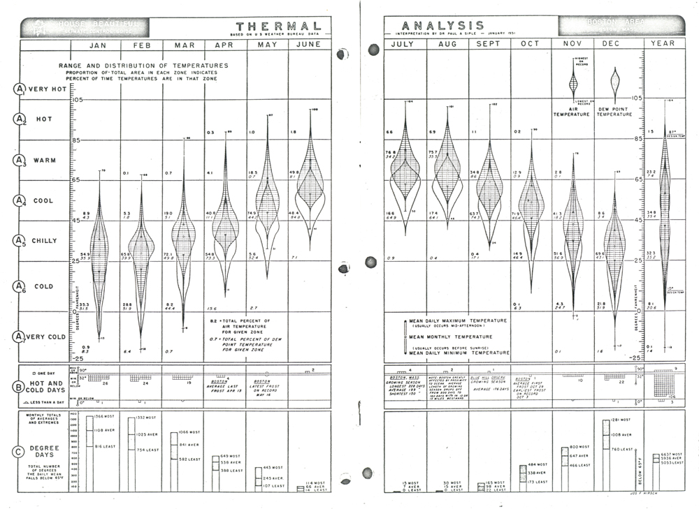 Though originally conceived to present general regional data, Fitch’s insistence that climate data was only useful when precise pushed the researchers toward a smaller scale. In the end, the AIA published thirteen pamphlets analyzing the climatic aspects of thirteen different metropolitan regions. Even here, as seen in Paul Siple’s "Climatic Map of Metropolitan New York and New Jersey," only those within the white band are similar enough for uniform application of the data presented; other micro-regions require additional adjustments, as noted in the key. The AIA also provided charts and diagrams—of solar and wind patterns, of summary thermal conditions—along with a list of techniques to mitigate potential effects. House Beautiful provided more schematic illustrations and an extensive series of articles that sought to convince the reader—the potential client—to engage questions of climate in their own house.