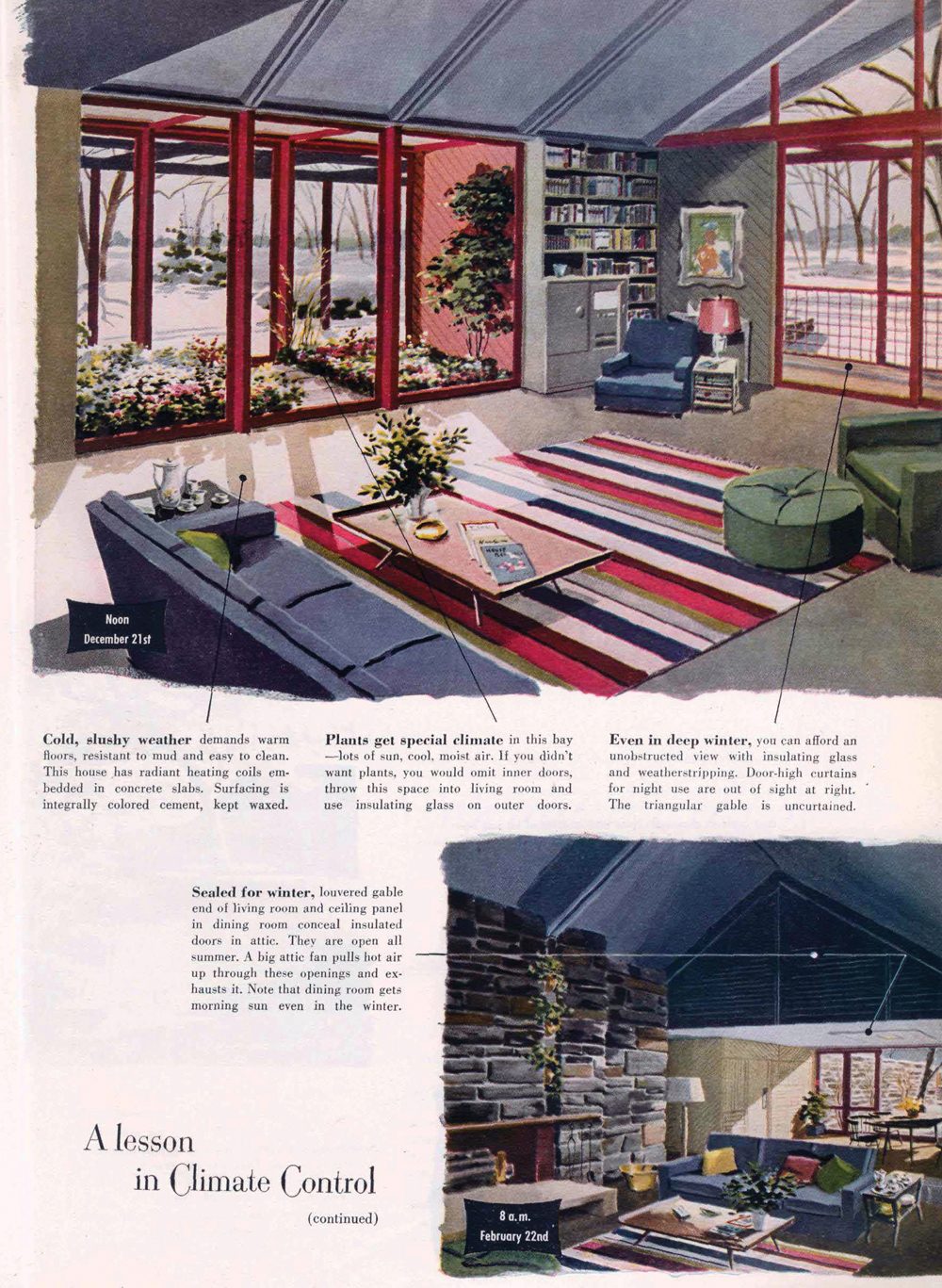 House Beautiful’s Pace Setter Homes program also integrated climate as one of its most important principles. The second Pace Setter house, designed by Emil Schmindlin and built in Orange, New Jersey, in 1949, demonstrated the ease with which modern idioms of outdoor living, expansive living rooms, and simple materials could be made comfortable across the varying seasonal demands of temperate climates.18 Schmindlin’s house, published in a lavish set of spreads just a month after the Climate Control Project was introduced, was directly aimed at improvements to living—“167 pace making ideas … including the new field of Climate Control” were shown on these terms. The house used insulated glass on the large south-facing wall, with integrated screens to block the sun in the summer. Ventilation inducement was effected through strategically placed openings, and a large tree was used for seasonal shade. Alongside the large photographs of the main living room and its fully glazed façade—in summer, in winter, and night, from inside and out—diagrams laid out the principles by which eaves, trees, and blinds excluded the sun in the summer and let it in during the winter, while maintaining privacy year round.