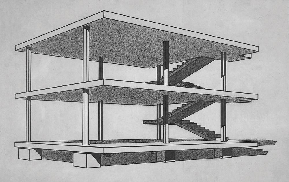 Across these two scales—the disciplinary and the case study—I want to offer two framing concepts for how the history of architecture can begin to be reconsidered. The first is adaptability: what architecture offered, in the early and mid-twentieth century, was a socio-technological apparatus—of materials, technologies, and concepts—appropriate to a wide range of situations, conceived of in terms of the capacity to adapt a general principle for a specific site or condition. This is a well-known premise of modern architecture, perhaps best emblematized by Le Corbusier’s 1914 “domino” diagram. This diagram is seen to suggest, according to a relatively simple set of new parameters—steel columns and reinforced concrete floors—a wide range of applications and adaptations. With it, Le Corbusier attempted, quite directly, to articulate a new idea at the scale of the discipline, one that would transform architectural approaches to the built environment. The general premise of adaptability is expressed in many other framing concepts that, in the inter-war period, encouraged new ways of thinking about the relationship between design, materials, and technology. These concepts have since been crucial to educating architects about the history of architecture’s modernization.
