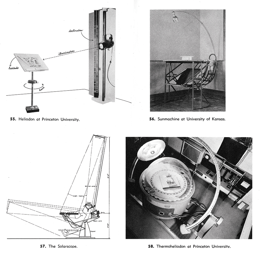 The Climate Control Project also begins to suggest the importance of simulation to the midcentury interest in climate. The ideal climatic interior was a space of aspiration, an image of a possible future in which design methods could maximize comfort, with all of the complex resonance of this term relative to the determinism just described. The Form and Climate Group was experimenting with heliodons to determine ideal site orientation, and with wind tunnels to test roof shape. The first heliodon in the United States, built by the planner Henry Wright in 1936, was a relatively simple device: the sunlamp was calibrated along the vertical calendar to provide the seasonal height, and the building was placed on a platform angled according to latitude. 20 The platform could spin to simulate diurnal patterns relative to the sun’s location.21 Other heliodons were built at the University of Kansas, Princeton, and at a number of the research stations in former British colonies.22
