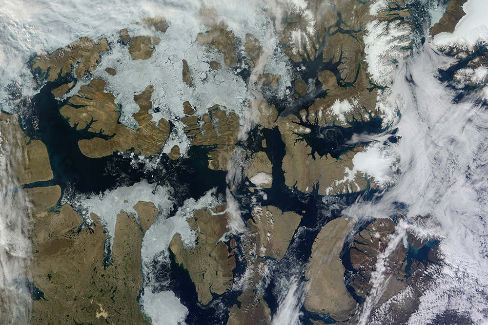 At the opposite scalar extreme is the equally prevalent, techno-scientific representation of the Earth’s surface garnered from the quasi-external, top-down vantage point of an orbiting satellite. Today, images taken from outer space reveal numerous signs of environmental distress, from the melting of glaciers and polar ice caps to desertification, air pollution, and more frequent and intense tropical storms.13 Such pictures are increasingly summoned to support the idea that we have entered an unprecedented epoch, the Anthropocene, wherein humans are interpreted as a newly geological force with the power to alter the planet itself, including its Earth systems. Like the famous photographs snapped aboard Apollo spacecraft in the 1960s and early 1970s that are their precursors, these contemporary satellite images, significantly, do not record national and other geopolitical boundaries, thus framing the planet as a natural body.14 It is clear, however, that they are the outcome and embodiment of specific geo-techno-politics, namely the decades-long, Cold War space race between the United States and Soviet Union that also gave rise to the (interrelated) development of cybernetics and Earth system science as an ever-more dominant frame for scientific analysis. The gaze of the satellite constructs a particular, highly technologized view of the world, not unlike the computer model through which infinite simulations have been run to assess current and future climate scenarios. Both must be considered relative to the broader visual regime of data through which climate change has largely been studied and communicated, and from which the scales of the global and planetary (which are not precisely the same) have become further solidified.15