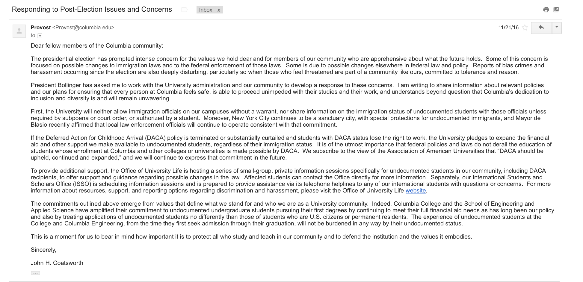 See Aaron Holmes, “University Provides Sanctuary and Financial Support to Undocumented Students,” Columbia Spectator, November 11, 2016, link. ↩
