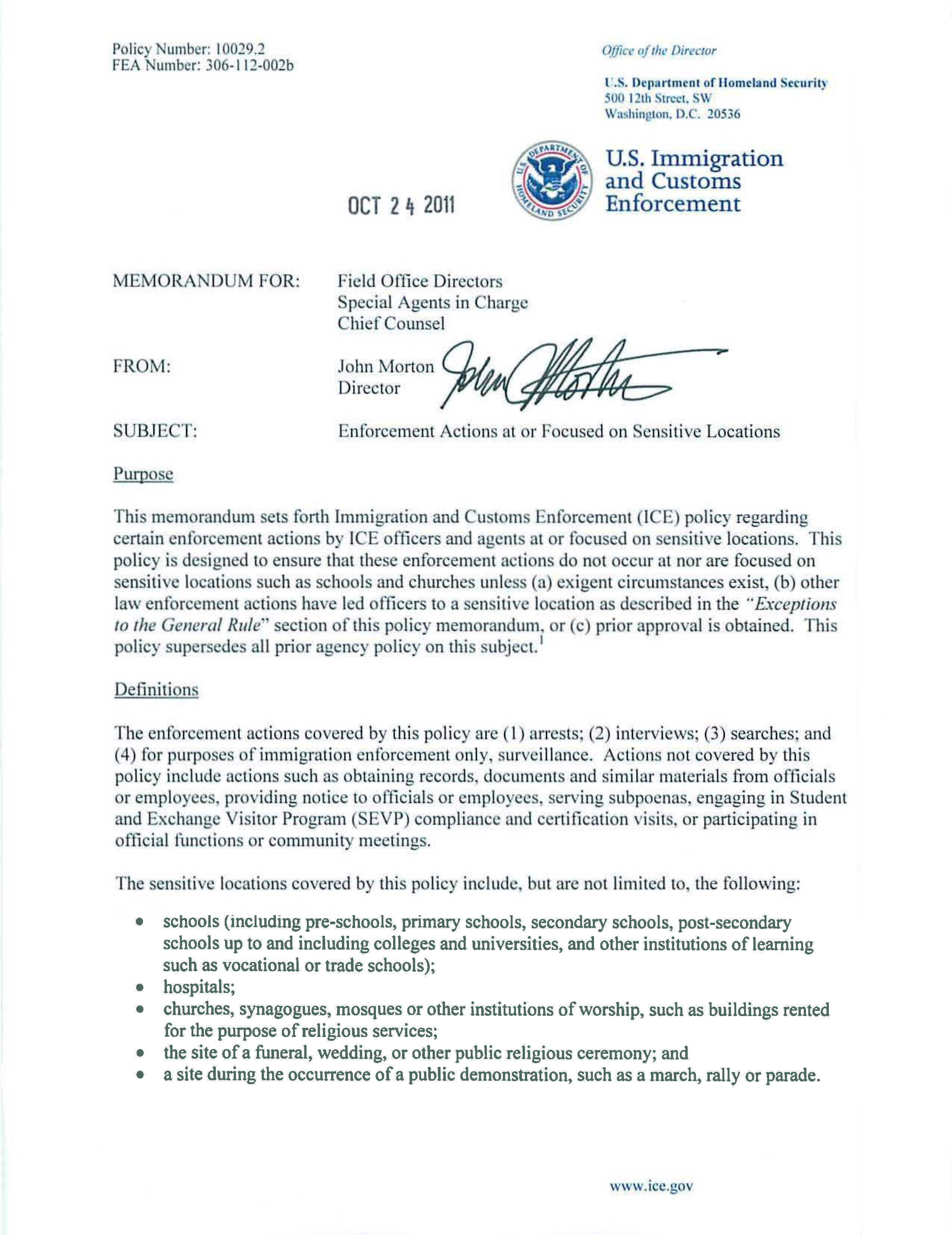 John Morton, “Enforcement Actions at or Focused on Sensitive Locations,” Memorandum for Field Office Directors, Special Agents in Charge and Chief Counsel, Department of Homeland Security, October 24, 2011, link. ↩
