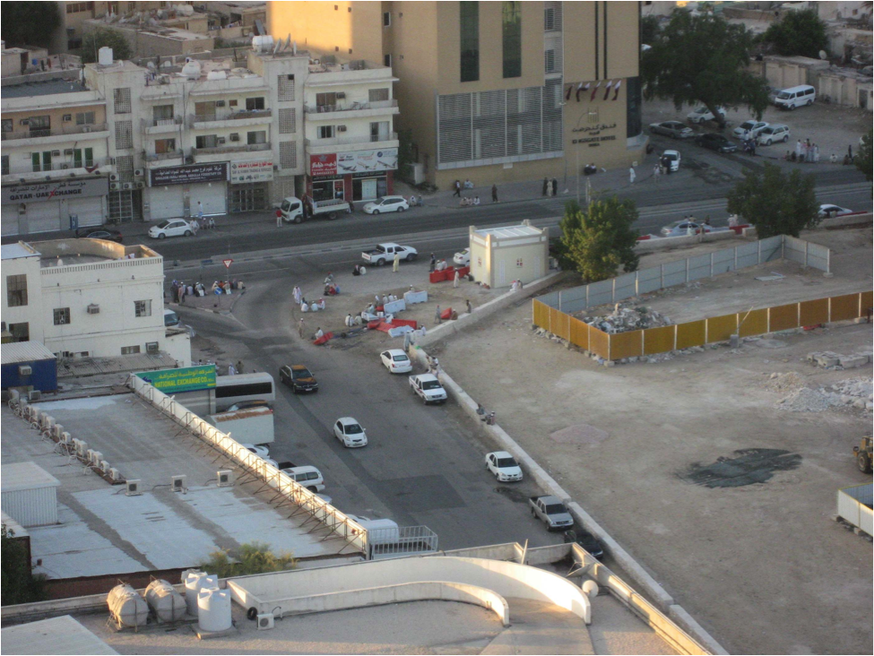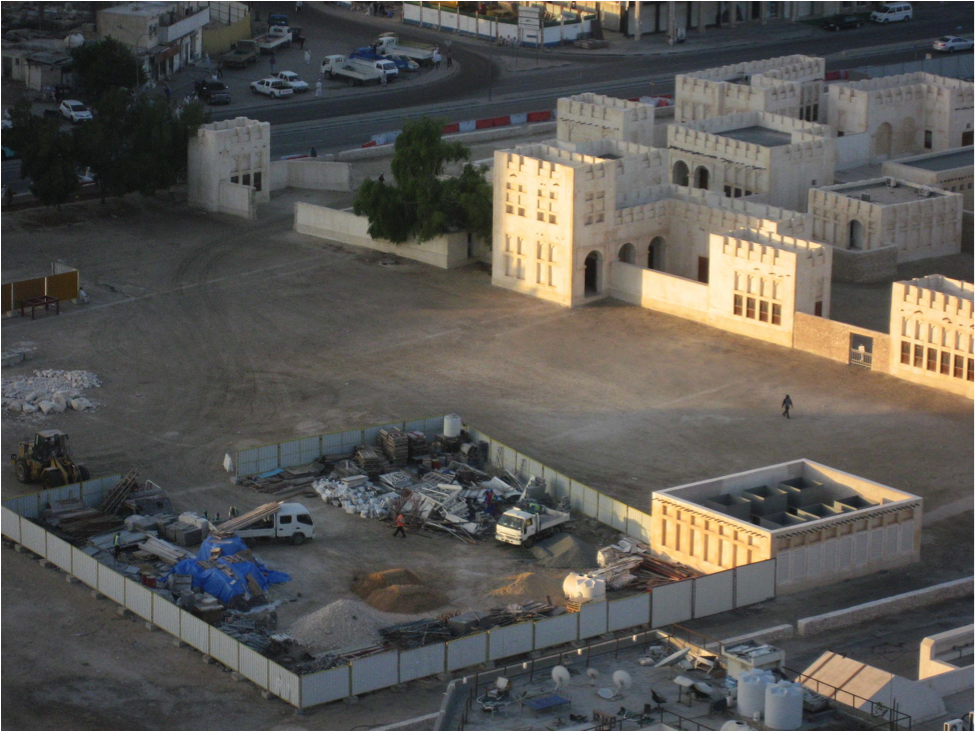 One of the largest construction sites in downtown Doha, the Msheireb, is barely visible to the east. Even from this distance, it is possible to see slender cranes in the empty air that will soon be filled in with residential buildings and stores.1 These are not the only cranes in this urbanism of the future, which for now is marked mainly by voids and fragments as a promise of what is to come. There is a crane that is barely visible on the Persian Gulf piers of Dhow Harbour, a crane partially occluded by high-rises that have already been completed, and a crane high above the tallest buildings in downtown Doha. The cranes comprise a network of construction equipment, connected by a specific date: 2022.