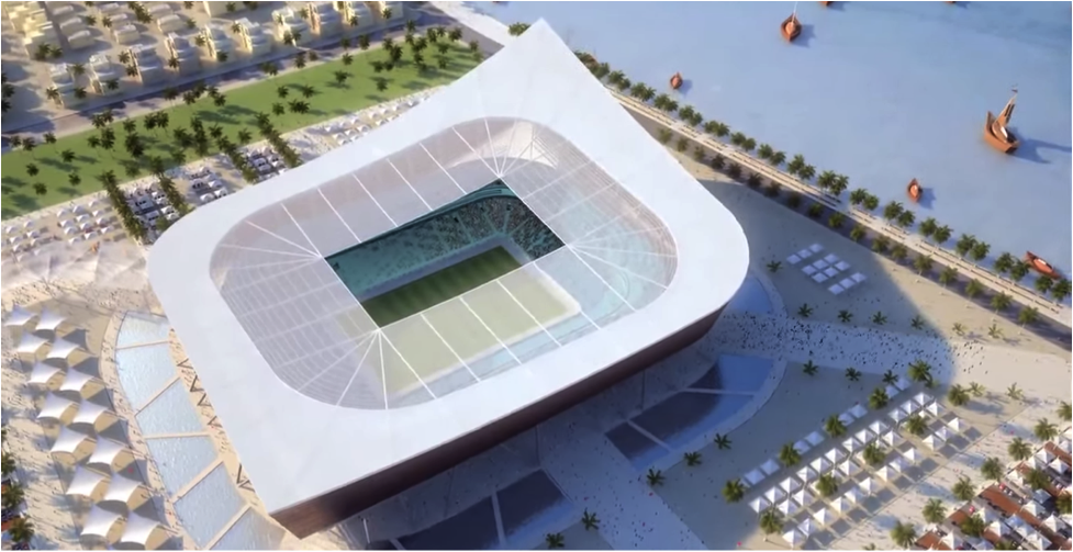 After the first minute of the animation, there is no doubt that the World Cup is symbolically linked to Qatar’s maritime history and location on the shores of the Persian Gulf. Looking more closely at the dhows from the side and overhead views, however, reveals something curious—there are no people in the rendered boats. There are people on land, walking toward the stadium and partially filling its seats, but the dhows appear to steer themselves, with a ghost crew that has been excised from the oceanic imagery. The World Cup architecture has therefore socially hollowed out the dhow by breaking it from its labor histories, presenting the forms of the sails and planks as an unpeopled fantasy of the past.