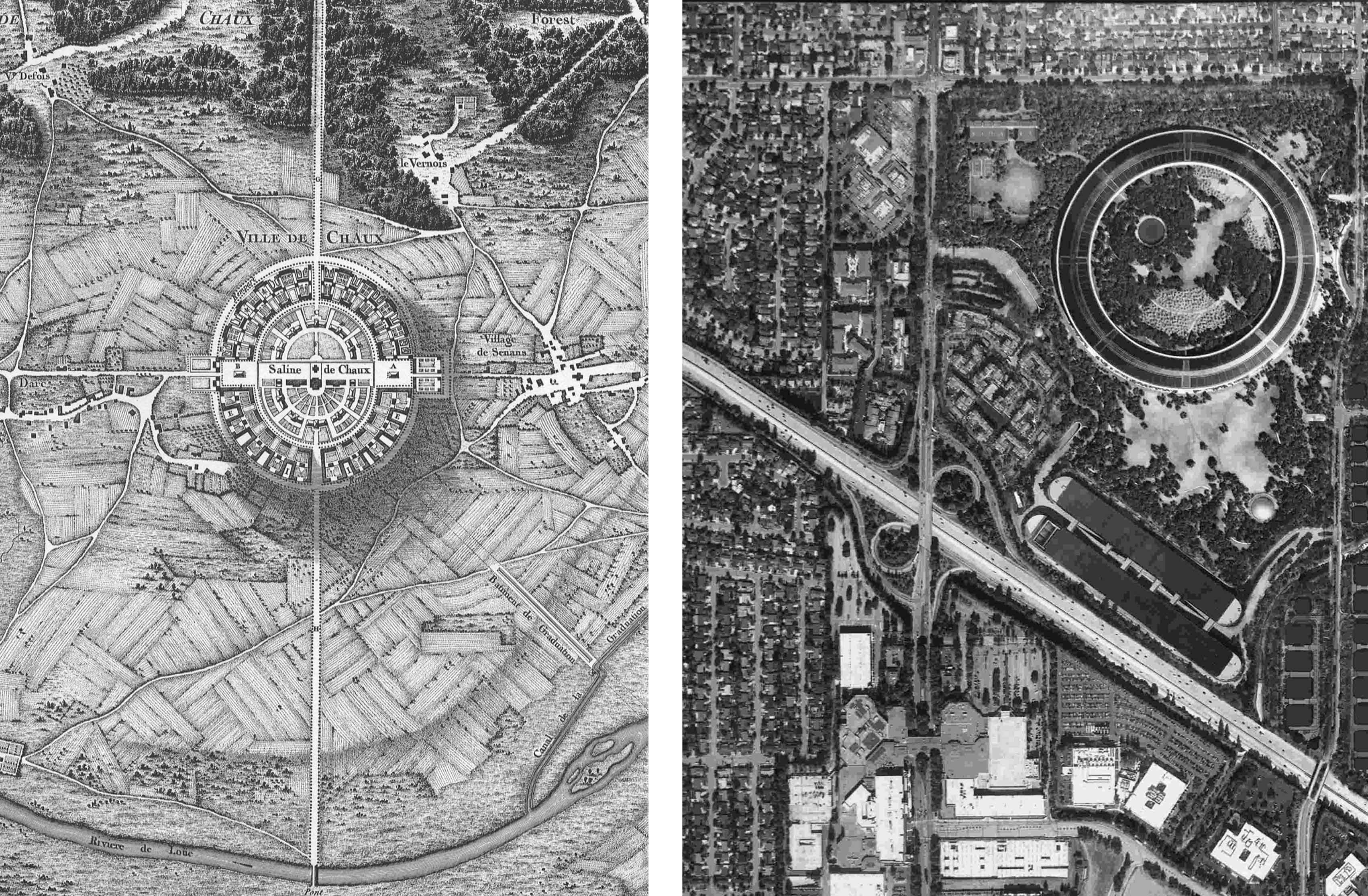 Urban design is not the only point of contact between Ledoux’s and Apple’s product. An abstract principle of autonomy could be seen as a trait d’union between the two, and this refers not only to the unity of design but also to the type of labor carried out in these spaces. In his essay on “Revolutionary Design,” Antoine Picon states that Ledoux proposed the rationalization of production by means of a rigorous spatialization, and that “the idea of surveillance, which was facilitated by the elliptical emphasis, played a crucial role, the gaze of the director being directed in turn at the various stages of the production.”15 But this surveillance, writes Picon, would have proved wholly ineffectual if there had been no consensus between workers and director. Thus, if the ellipse—or rather, the circle—is a form of surveillance, it could also be considered the form of the social contract: “the factory and its environs were the framework for a perfectly adjusted social representation; the ellipse and the circle also referred to the notion of a community that was transparent.”16 The same transparency was invoked by Jobs, who has stated that he designed the campus as an amphitheater, which should be a symbol for sociability.17 Although Apple Park hosts a different kind of community of production—a community made up of immaterial workers—it shares certain similarities with the Royal Saltworks of Chaux.18 But if the second project for the Saltworks—an ellipse-shaped figure—was morphologically akin to the Apple ring, then the first one—a building shaped like a castle—reveals a deeper typological analogy still. Here, all of the factory facilities were arranged in a continuous quadrangular body, creating, according to Antony Vidler, a “type form” that unified all of the community’s needs within a unique diagram—just like Apple’s circle.19