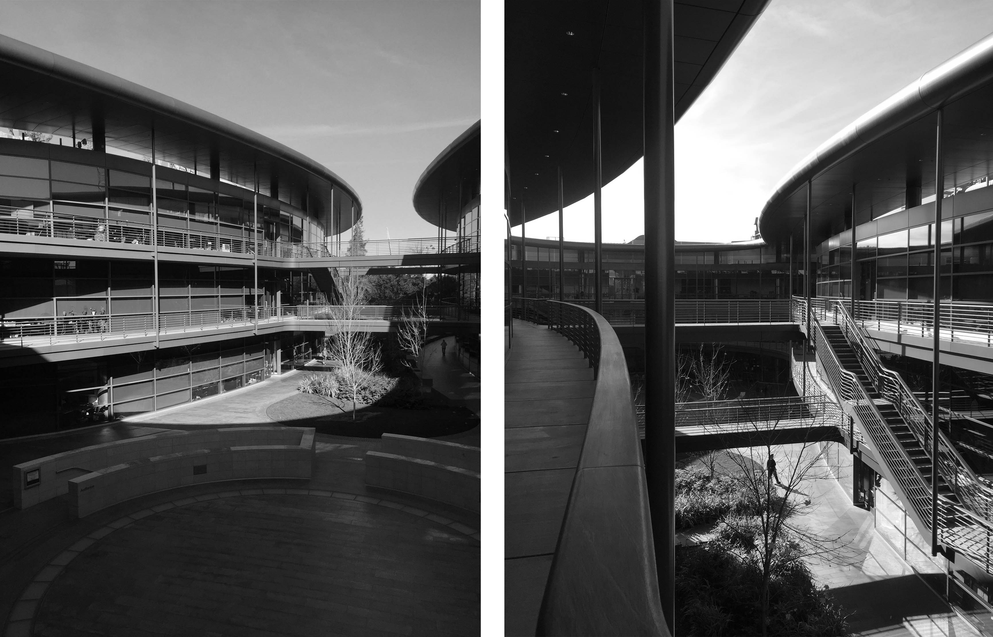 In some aspects, the Apple ring is comparable with another building, designed by Norman Foster as part of Stanford University: the James H. Clark Center for Biological Sciences. Intended to embody the collaborative spirit of interdisciplinary research, the Clark Center demonstrates the same Apple ring’s idea of a central void, onto which all of the building’s windows overlook. 14 Moreover, in the center of its open circular court, it houses two theaters where scientists can meet, share, and show their projects. The first of the two theaters is marked by a circle drawn on the ground while the second one, as in the Apple Park’s theater, is a meeting room underneath it.