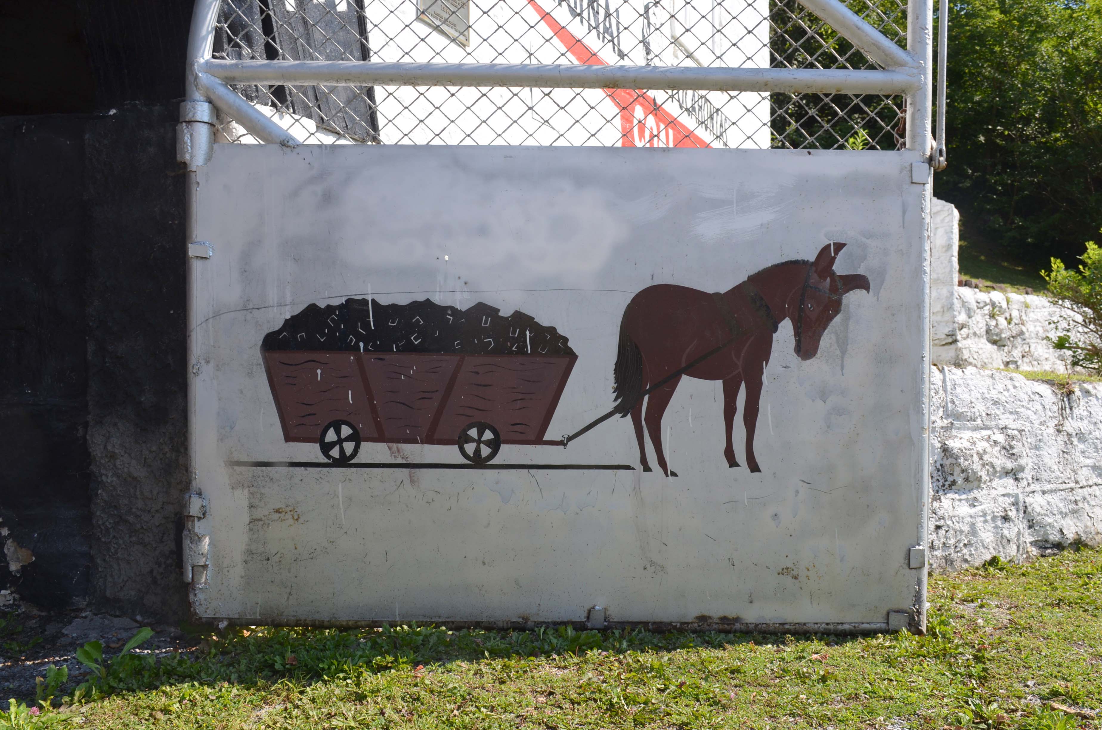 “I keep this door closed for dogs, kids, and bears,” our guide, Tammy, tells us as she opens the portal for the day. On the inside of the gate is a painting of a mule, memorializing the mine’s three hundred nonhuman laborers. The walking route makes a loop and exits through a different portal, likewise marking out a history of mining techniques and preserving some of the geological oddities—fossilized fish, kettle bottoms—that pervade the mines. In the 1960s and ’70s you could drive through the exhibition mine (the exhaust of the cars ended up eating away the varnished protection of the coal), and the signage and displays are still arrayed for vehicular viewing. This is decidedly high coal, with a range of around twelve to fourteen feet in height, and its proximity to the grade level of the valley outside made for comparatively easy work, if one could say such a thing about such hard and dangerous labor.