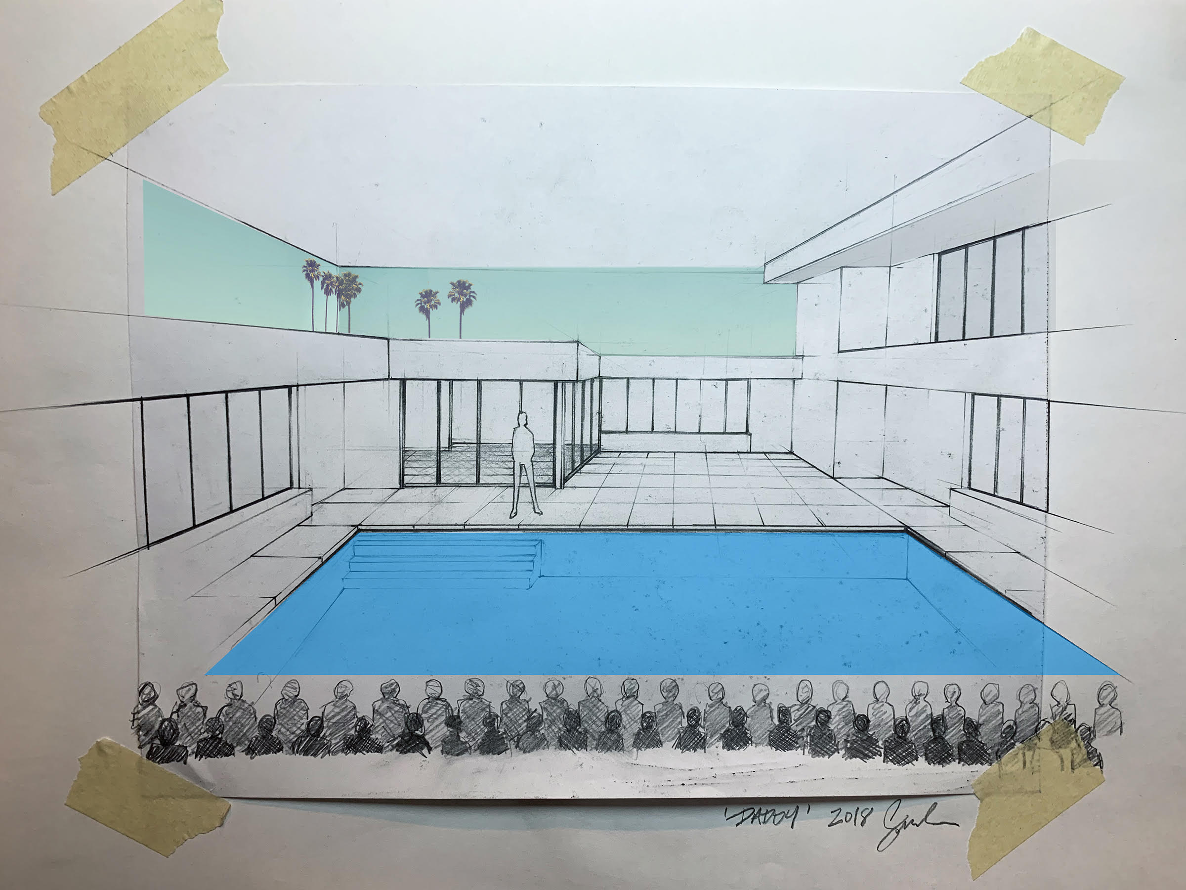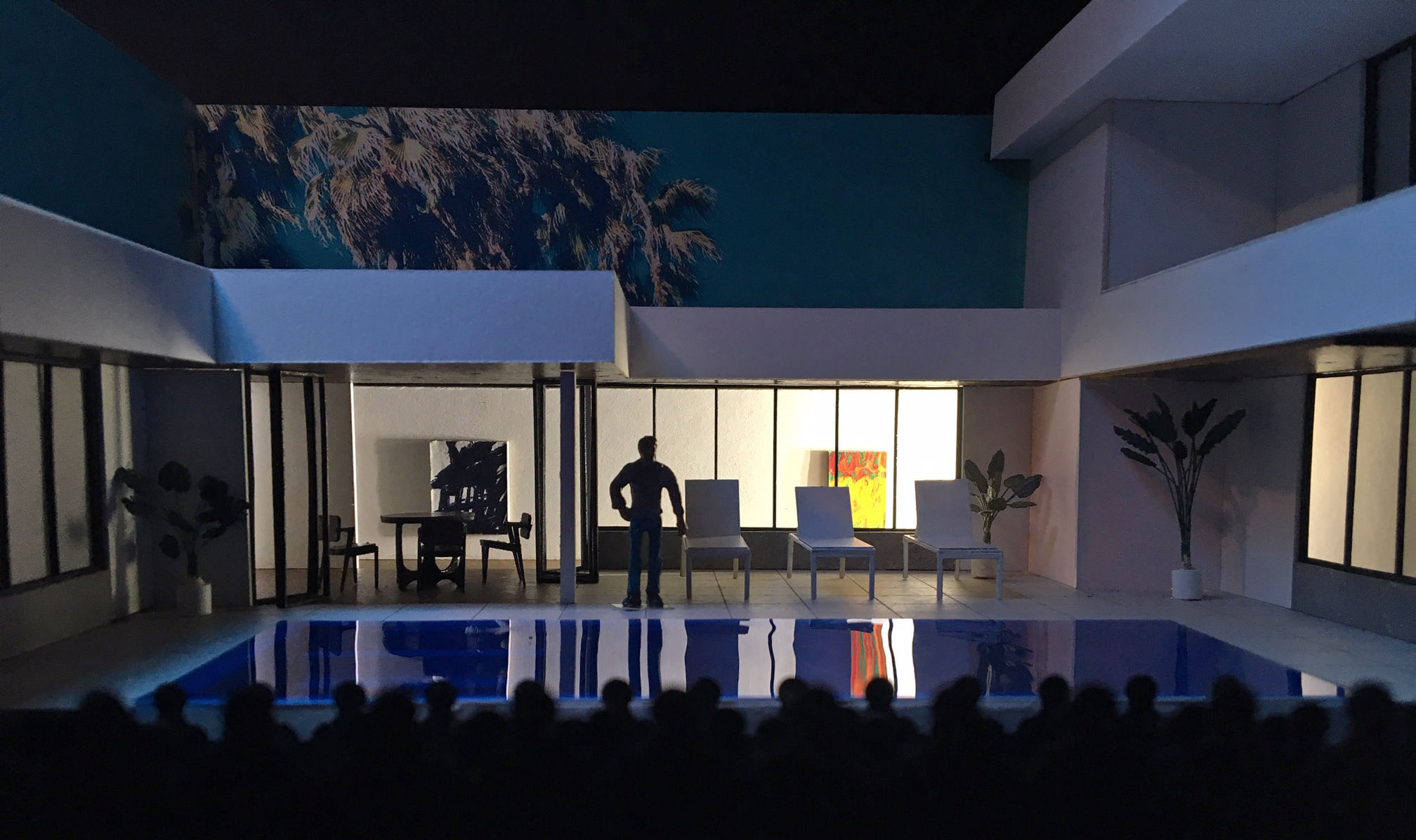 Daddy is staged as a site-specific architectural performance, albeit one transplanted to the stage from the Angeleno canyons. The action plays out poolside in the present day, in a 1:1 reconstruction of a Bel Air estate, zip code 90077, designed for Daddy’s debut by Matt Saunders, complete with functioning pool.3 The audience is seated where one might typically expect a citywide vista, equipping them with a view across the pool deck and into the glass enclosure of the modernist villa immediately behind. Imagine the scenography of A Bigger Splash with the architecture of Beverly Hills Housewife, both painted by Hockney in 1967. This literal reflection of view strips the domestic interior of the privacy otherwise granted by the villa’s typical isolation, delivering on the voyeurism implicit in modernism’s embrace of transparency. This puts the home’s residents—Franklin, a black twenty-something artist who still speaks with a hint of a southern accent, and Andre, the house’s white art collector owner and Franklin’s Daddy figure—at the fore in an architectural tradition that developed concurrent with the cult of the male body as evinced by the personal account of Harris’s artistic referent, Hockney.