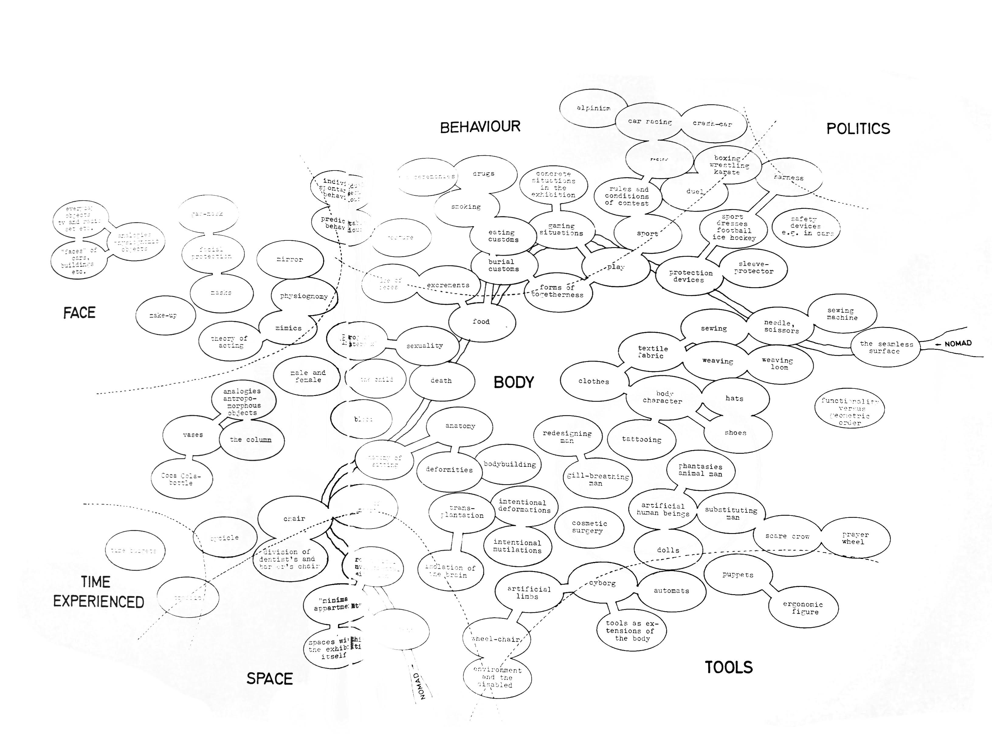 Shortly after Gold’s Gym opened in 1965, Lyndon B. Johnson launched the Presidential Fitness Award. A decade later, the design of the body resonated with new audiences as the Whitney Museum opened Articulate Muscle: The Male Body in Art in 1976, while in that same year the Cooper Hewitt, National Museum of Design in New York City, opened its inaugural exhibition, Man TransFORMS, directed by architect Hans Hollein. Orbiting the central figure of “THE BODY” in a structuring diagram of thematic bubbles in the exhibition catalog: “bodybuilding,” “death,” “cosmetic surgery,” “sexuality,” “redesigning man,” “dolls,” and “puppets,” among others.10 A year later, Pumping Iron opened in American theaters, further fostering the mainstreaming of mass fitness culture.