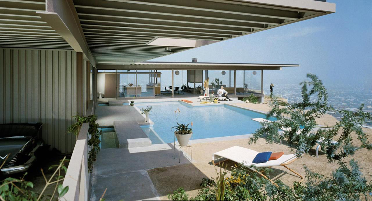Julius Shulman, photographer of many of LA’s Case Study Houses, including the Koenig one that drew Hockney to California, was among the first of his generation to include people in his images, using architecture to stage a theater of domesticity. A couple sits down to eat while children play ping-pong (Mirman Residence); a woman sits on a couch in a blue dress while her suited husband puts a record on (Bailey House); a couple enjoy a cocktail poolside while a friend surveys the land beyond through a pair of binoculars (Stahl House). 20