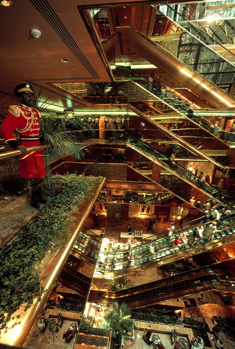 In a review of the tower from the same year titled “Atrium of Trump Tower is a Pleasant Surprise,” New York Times architecture critic Paul Goldberger extends the material fetishization of the Vogue advertisement into the interior of the building, where he writes that the pervasive finish of breccia pernice marble “gives off a glow of happy, if self-satisfied, affluence” to tourists and shoppers in the lower galleries.13 Though Goldberger criticizes the overall profile of the building and mirrored glass façade, concluding that “in the process of achieving a balance between a building’s public presence and its private one, the decision was made to make the private presence paramount,” he omits the reciprocal relationship between the additional leasable floors and the atrium, expressing sympathy instead for the architect who must mediate between the contradictory demands of public and private interests and the famously bad taste of the client.14 Goldberger is surprised not by Trump’s ability to maximize the square footage of the tower but by his formal restraint, expressed as a kind of unexpected generosity.