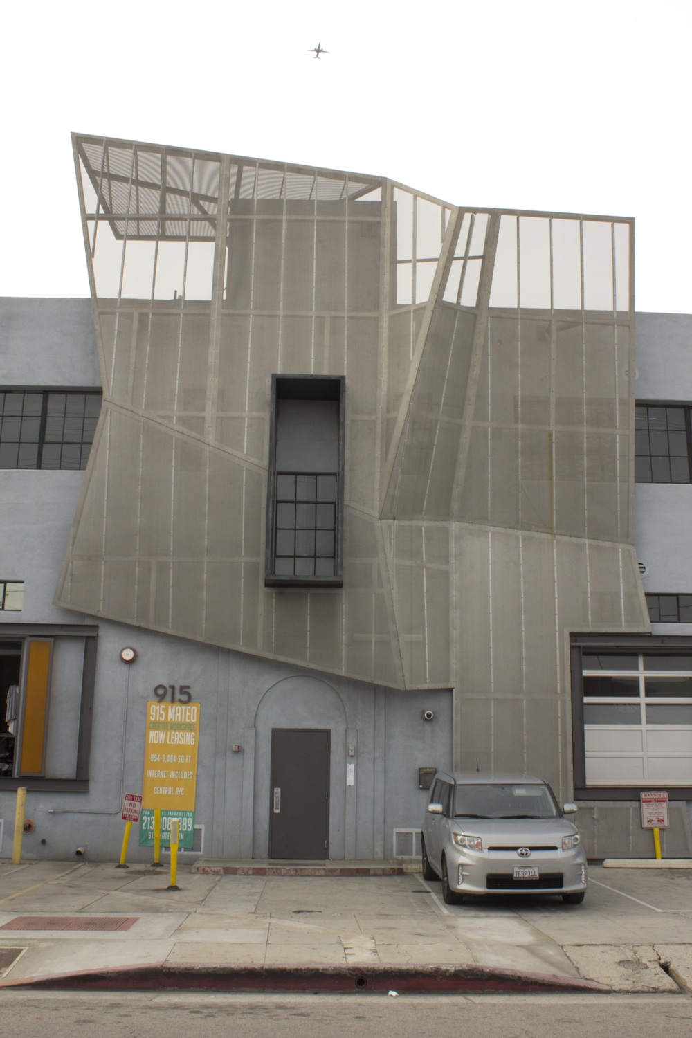 What meaning, if any, can be assigned to the affordable and creative shape that adorns the entrance of 915 Mateo in Los Angeles? The faceted metal scrim that extends from the sidewalk to the roof serves no obvious purpose; it is an independent structure, suspended from the concrete walls of a freestanding warehouse, open to the elements at every edge, difficult to clean, and redundant as a sun- or rain screen since it covers areas that are almost exclusively opaque and impermeable. These nonfunctional characteristics give the scrim a kind of surplus quality as an accessory to the no-frills renovation behind it. If the façade, in Gottfried Semper’s Four Elements of Architecture, could be described as dressing or bekleidung—a symbolic covering that simultaneously dematerializes and articulates the “structural technical” core of the building—here, the metal scrim acts more like a fascinator: a tiny decorative hat that seems to announce, “It’s a special occasion [for creative loft living].”2