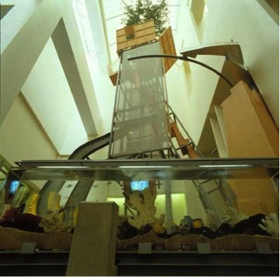 In this dramatic interpretation, the static and inanimate elements of Moss’s architecture are imagined as living tendons, bursting out of their traditional confines through heroic effort. These kinds of staged displays played out across the city, beginning in the late 1970s with Frank Gehry’s double-wrapped Santa Monica House, to Eric Owen Moss’s plumbing columns at Paramount Laundry in Culver City, to Morphosis’s “play sculpture” inside the Cedars-Sinai Cancer Center in Beverly Hills. Alternately labeled “plus modern,” “technomorphism,” and “en-formality” by the numerous architects and critics who sought to unite the work under the banner of a cohesive school, many of these projects involved the juxtaposition of some standard structure with a fragmented, layered, and didactic assembly of “as found” materials—exposed concrete, weathered steel, chain-link fence, plywood, corrugated aluminum, and with increasing frequency, metal scrim.7