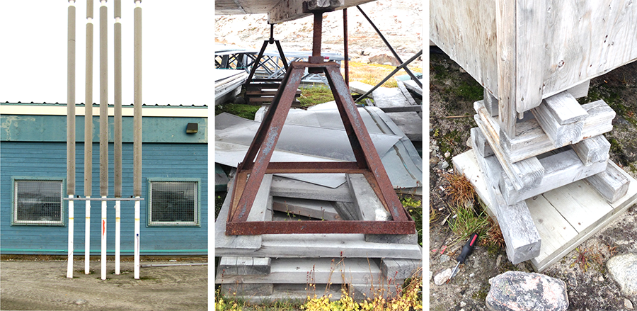 An array of strategies has been developed to prevent the ground’s thawing, from insulation under the slab to thermosyphons.44 Thermosyphons are passive cooling devices that, employing pressured heat exchange, draw out the heat from below the building.45 Commonly, steel piles are driven into the permafrost to support buildings, drilled at least two times deeper than the active layer’s thickness.46 Piles move by creeping (moving down) or frost-jacking (moving up) as permafrost warms or as the active layer gets thicker.47 A less costly alternative is the use of adjustable screw jacks, sitting 2 feet above the ground on wooden planks or a thick gravel pad, preventing the building’s heat from descending into the soil. The space under the house allows the wind to dry excesses of water and disperse the snow to avoid accumulation, which would naturally insulate the soil.48 The screw jacks can technically be adjusted to level the house, distributing stress on the structure. However, in practice they are not always adjusted when the appropriate equipment is absent. The foundations made by the Kangiqtugaapingmiut for their cabins, workshops, and sheds—also called “wood cribs”—generally consist of a stack of wood, parts of which are added as needed to level up the cabin. They are effective because residents can regularly adjust the foundations with simple tools. Buildings tend to be close to the ground, proximate to but not quite kissing the topography of the site. Some foundations are even made like qamutiik: attached with ropes.49 They do not require hardware and can be disassembled and reused. They are therefore flexible and adapt better to the ground’s fluctuating conditions.