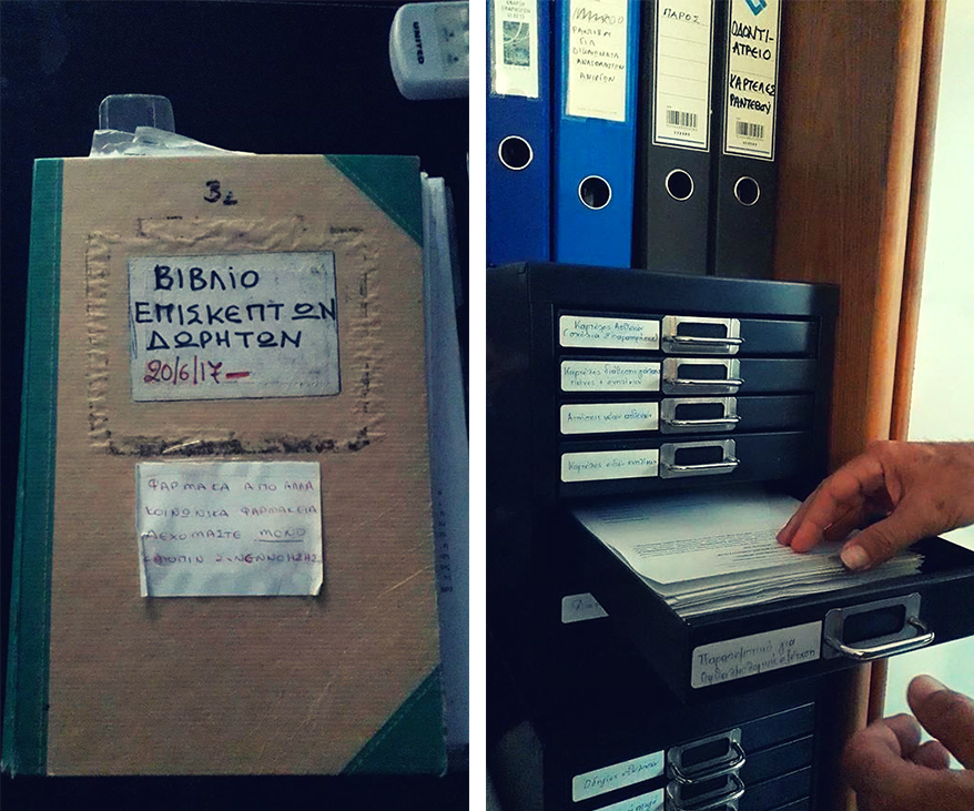 Distribution and redistribution of resources but also of tactics, strategies, and knowledge is a crucial practice among solidarity health structures. Many solidarity clinics and pharmacies document and share their activities, experiences, resources, alliances, spatial configurations, and maintenance protocols with the entire self-organized network of solidarity initiatives in Greece.22 The typical archive of a solidarity clinic consists of bills and cost templates, shift schedules and medicine catalogs, inventories of equipment and sketches of spatial layouts, architectural drawings of the property and photographs. The solidarity clinic redistributes health care activities, including medical care provision, as well as the redistribution of all the objects and technology linked with this alternative health care infrastructure. This includes an economy of furniture, sophisticated medical equipment, manuals for the maintenance, repair, or building of your own medical items (e.g., disposal bins). It is the diffused nature of the solidarity clinics, and the fact that knowledge, skills, and protocols are transferred within and between the initiatives that are part of the solidarity network, that substantially increases their endurance.