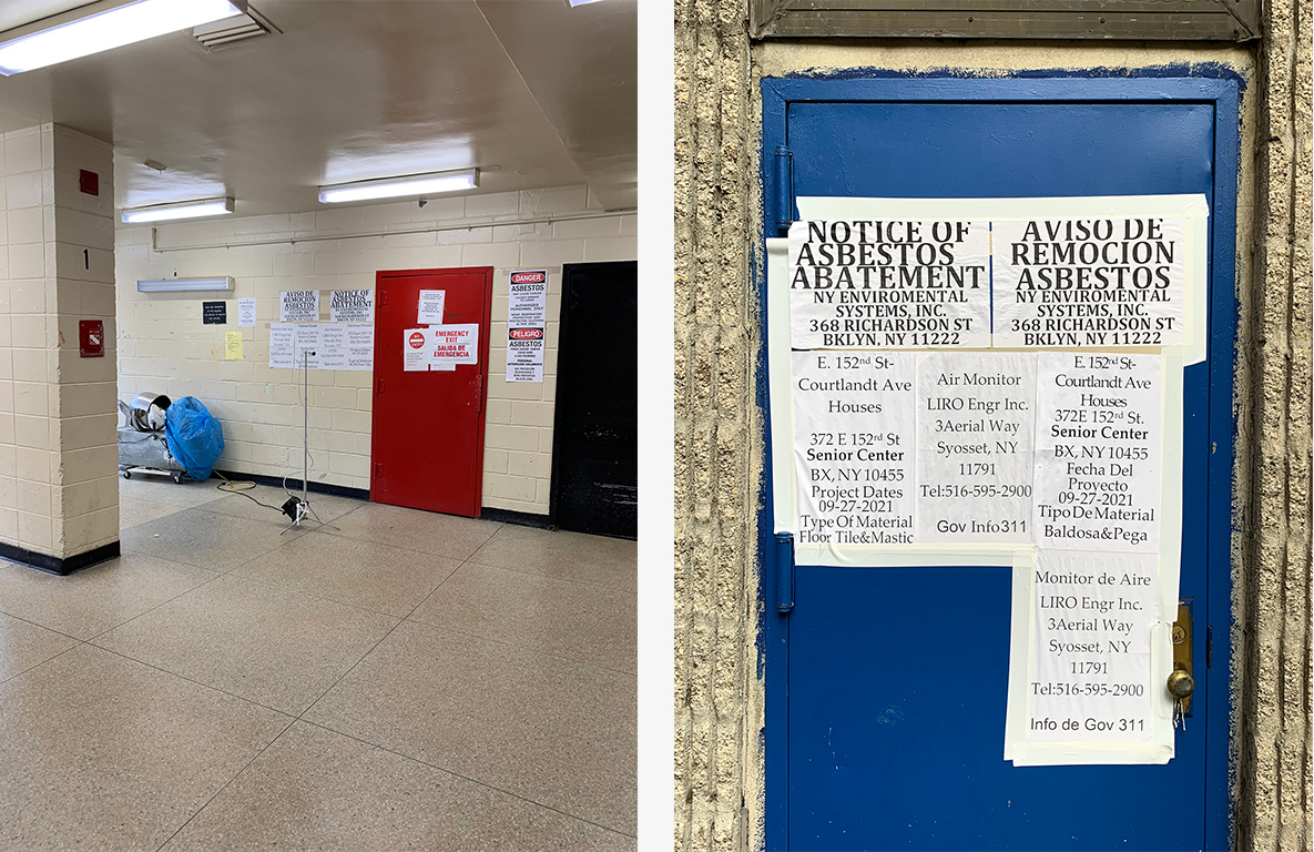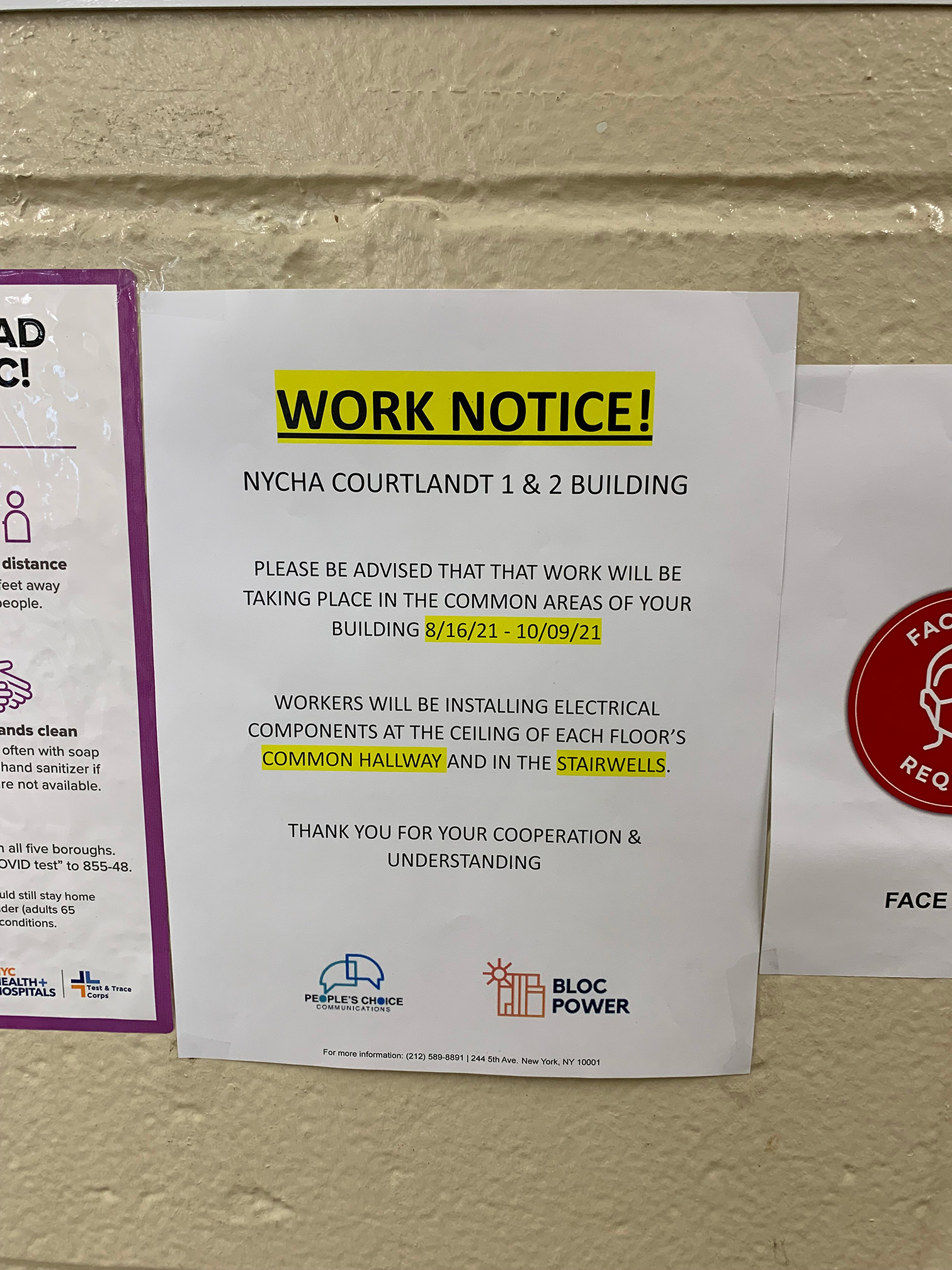 In late 2021, during my second year at Columbia, I received a studio brief for a housing complex on the site of the Courtlandt Houses. On one of several visits to the building, I found People’s Choice volunteers parked in a sprinter van outside. Workers were running cables down from a rooftop node to floors inside the building. Though the installations suffered some delays (an expected completion date posted in the lobby had passed by several weeks), they generally occurred swiftly, representing the most ambitious building-wide project the complex had seen in decades. However, while progress was made on the roof, the senior center and kitchen on the ground floor had been closed for months awaiting asbestos removal. A security guard I spoke with lamented the slow process, predicting it would be many more months before the hazardous material would be removed and the community facilities could reopen.29 Internet service, which had been installed with the hope of making building repairs easier, was, at least for now, powerless to move the bureaucratic gears behind asbestos abatement.