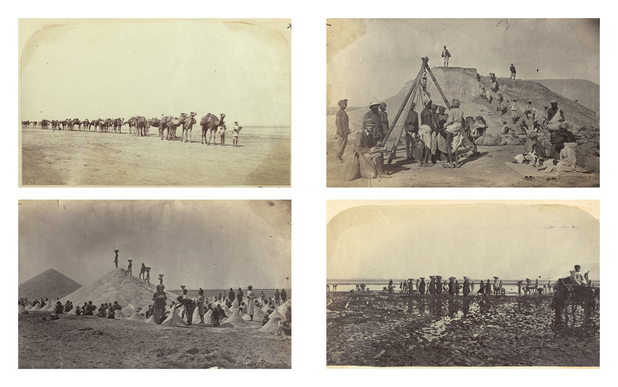 Unknown, A Katar or String of Camels Taking Away the Salt [Sambhar Lake], Photographic print (12-09-2008, 1870s), Exhibition: Asia, Pacific and Africa Collections, The British Library; Unkown, Filling Salt into Bags and Weighing the Salt [Sambhar Lake], Photographic print (12-09-2008, 1870s), Exhibition: Asia, Pacific and Africa Collections, The British Library; Unknown, Measuring Labourers’ Work and Storing Salt [Sambhar Lake], Photographic print (12-09-2008, 1870s), Exhibition: Asia, Pacific and Africa Collections, The British Library; Unknown, Sambhur Lake. Extraction of Salt from Bed of Lake, Photographic print (12-09-2008, 1870s), Exhibition: Asia, Pacific and Africa Collections, The British Library. ↩
