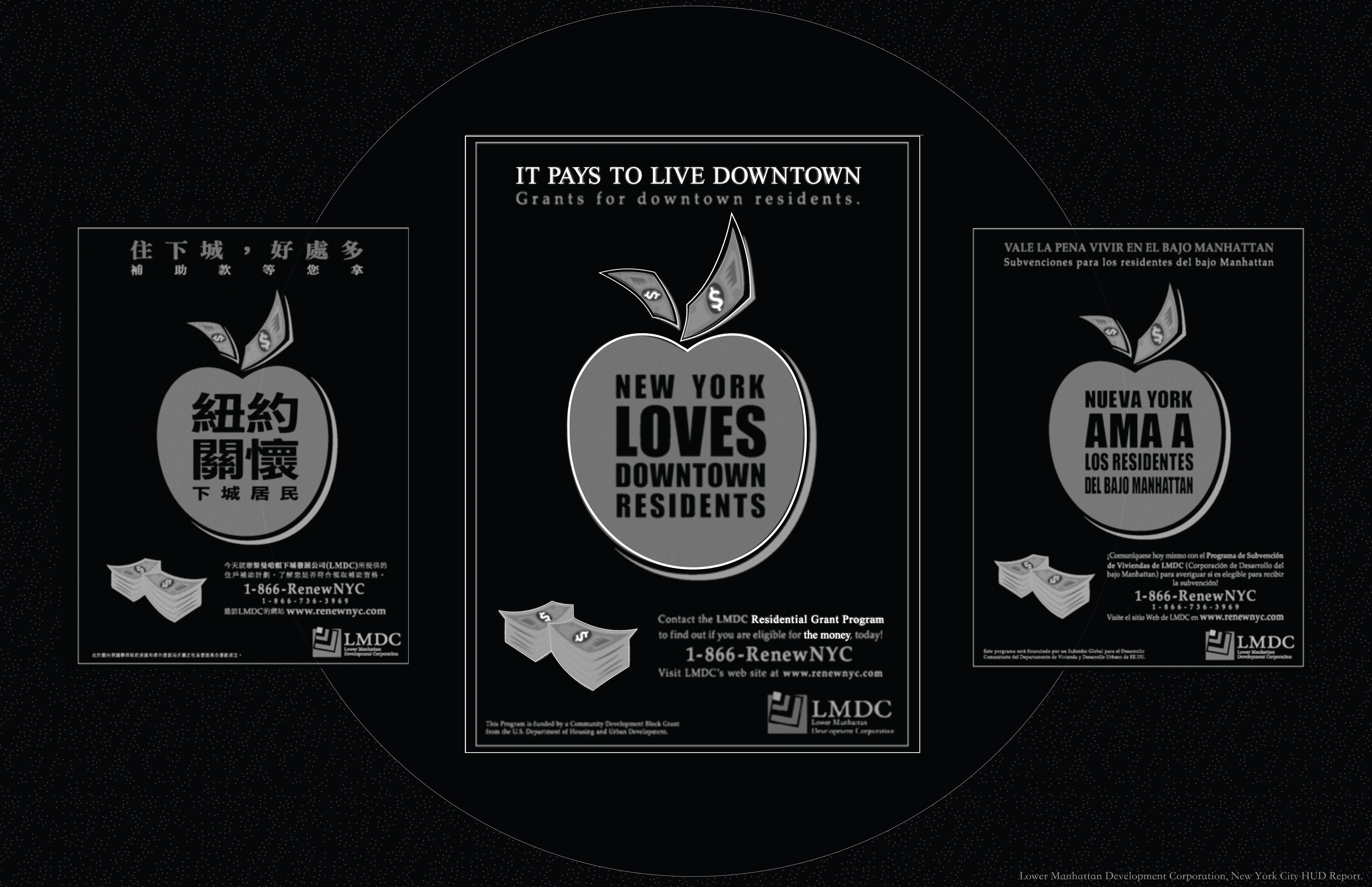 The LMDC was formed immediately after the attacks to plan the overall reconstruction of the neighborhood; its funds amounted to approximately $18 billion, which included Housing and Urban Development’s Residential Grant Program. According to the Residential Grant Program’s own report, over $227 million in grants were dispersed to a combination of 156 businesses and 39,805 households from 2001 to 2003—only a little more than 1 percent of the overall reconstruction funds.21 In fact, if the funds utilized had been divided evenly among the households served, the grant have would amounted to only $5,700 per household, barely enough for six months of survival in New York City. Nevertheless, the LMDC created a campaign to publicize its program, with posters that featured a big red apple growing money reading, “IT PAYS TO LIVE DOWNTOWN: Grants for Downtown Residents,” and proclaiming, “New York Loves Downtown Residents.”22 These posters, which hugely emphasized symbols of cash, were also translated into Chinese and Spanish, the languages predominantly spoken in the lower-income neighborhoods north of the World Trade Center: Chinatown and the Lower East Side, respectively. While the subsidies were helpful in theory, the translated posters signal that they were intended to directly attract low-income communities, communities of color, and those most at risk of homelessness in the face of disaster to an area known to be contaminated.