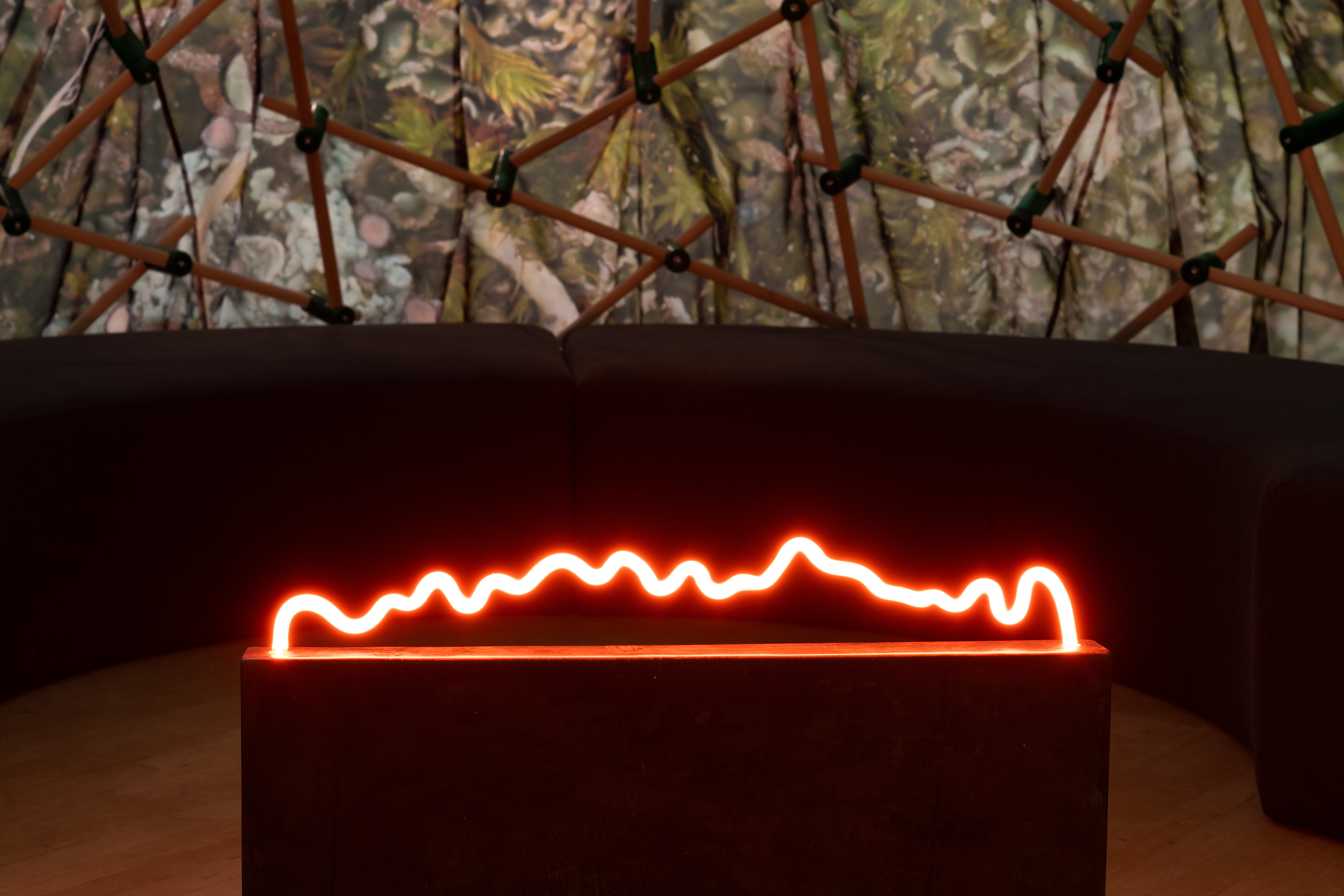 asinnajaq, Nuna, 2022. Maple dowels, printed fabric, upholstered bench, and neon qulliq. ᐊᖏᕐᕋᒧᑦ / Ruovttu Guvlui / Vers chez soi / Towards Home, installation view. Courtesy of CCA; photograph by Mathieu Gagnon.