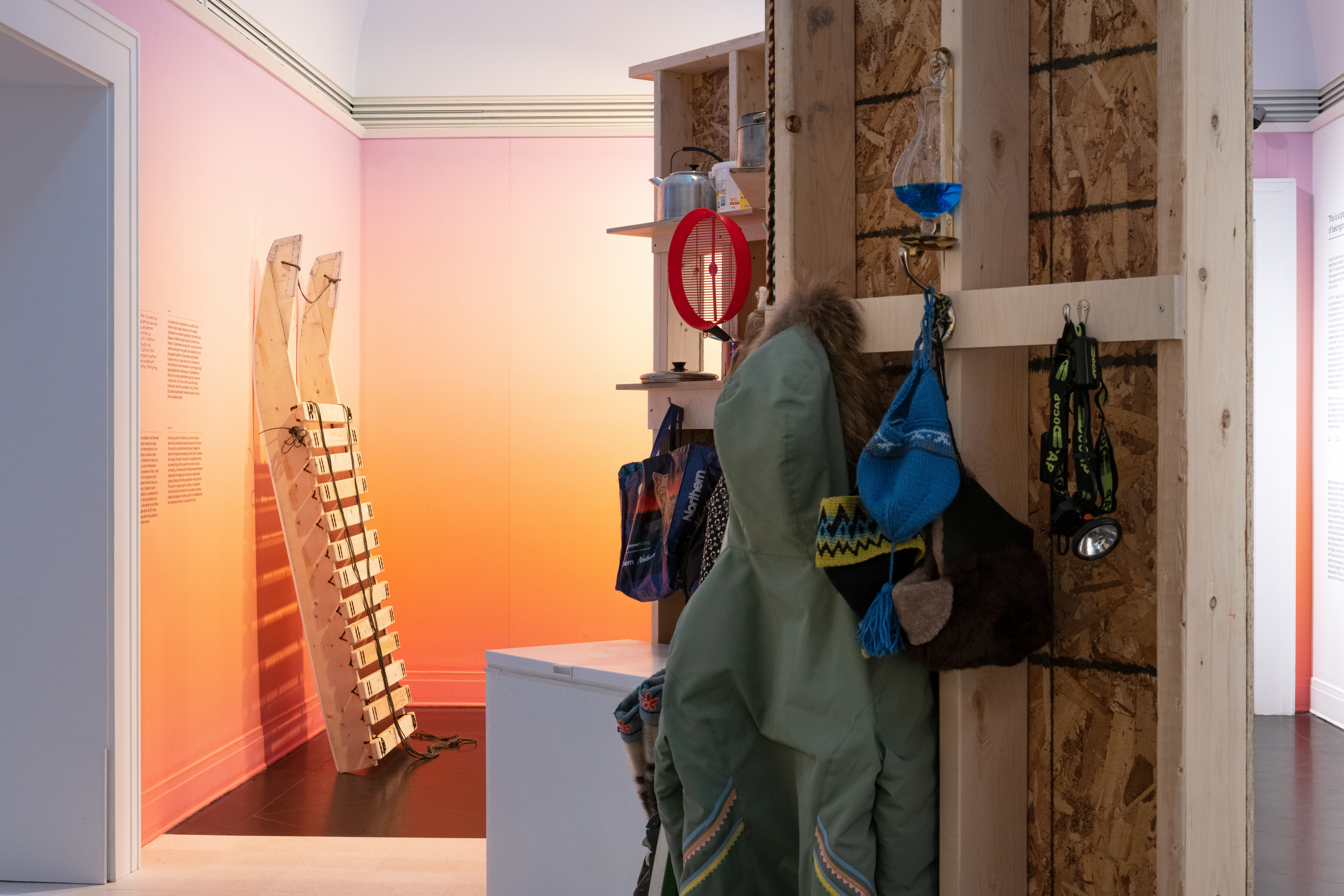 The entrance to ᐊᖏᕐᕋᒧᑦ / Ruovttu Guvlui / Vers chez soi / Towards Home includes a full-scale model of a typical cold-weather porch. Ruiz described this as a gesture of welcome to Inuit and Sámi visitors and an indication that the show would focus on Indigenous artists’ own contexts and references. The plywood porch, set in the museum’s main throughway, held all manner of household items that would usually be too wet, muddy, or frozen to be brought indoors, yet still need preservation from the outdoors. These articles, amassed by co-curators Partridge, Piirainen, and Nango, included a deep freezer, a fishing rod, braided grass used for stuffing shoes, skis, kamiit (Inuit sealskin boots), nuvttuhat (Sámi reindeer boots), and many other tools for living in the cold. They all hang in a pristine jumble, the objects devoid of the scuffs, stains, and watermarks that would reveal daily use.