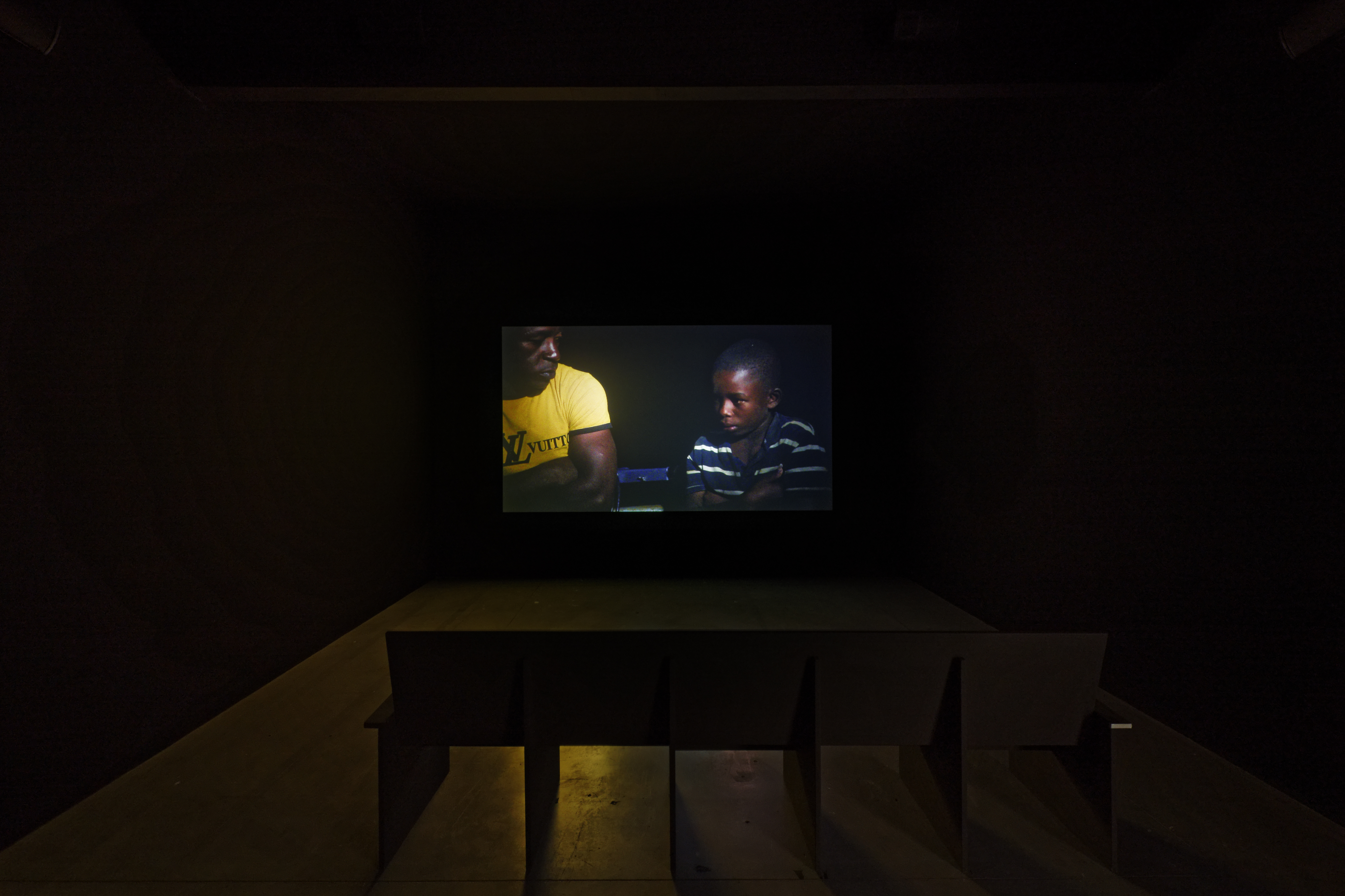 It was refreshing to see a piece like Ortiz’s that directly named and imagined the violence that other works were more tacitly responding to, which was why it was jarring to next descend to the Palais de Tokyo’s cool basement level, where French artist Laura Henno’s films were being screened in dialogue with the works of Réclamer la terre. Since 2013, Henno has been collecting footage in Mayotte, a small island department of France, off the coast of Madagascar. In one small room lined with pew-like benches, the film KOROPA (2016) was playing. It features tight close-ups of the strained face of a young boy named Patron, being trained by an older smuggler to navigate a small boat across the water between the islands of Anjouan and Mayotte. According to the wall text, because Patron’s youth exempts him from arrest under Mayotte’s anti-smuggling laws, he has become an attractive partner to older smugglers. The film made me deeply uncomfortable. It mercilessly tracks Patron’s resigned face as he receives instructions on how to handle the police. Unlike the closeness in Calfuqueo’s Kowkülen (Liquid Being), which gives the nude figure the privacy of anonymity, there was an untrustworthy intimacy to Henno’s movie. I felt implicated by the knowledge that this young person’s participation in a desperate trade was being exposed by a French filmmaker.
