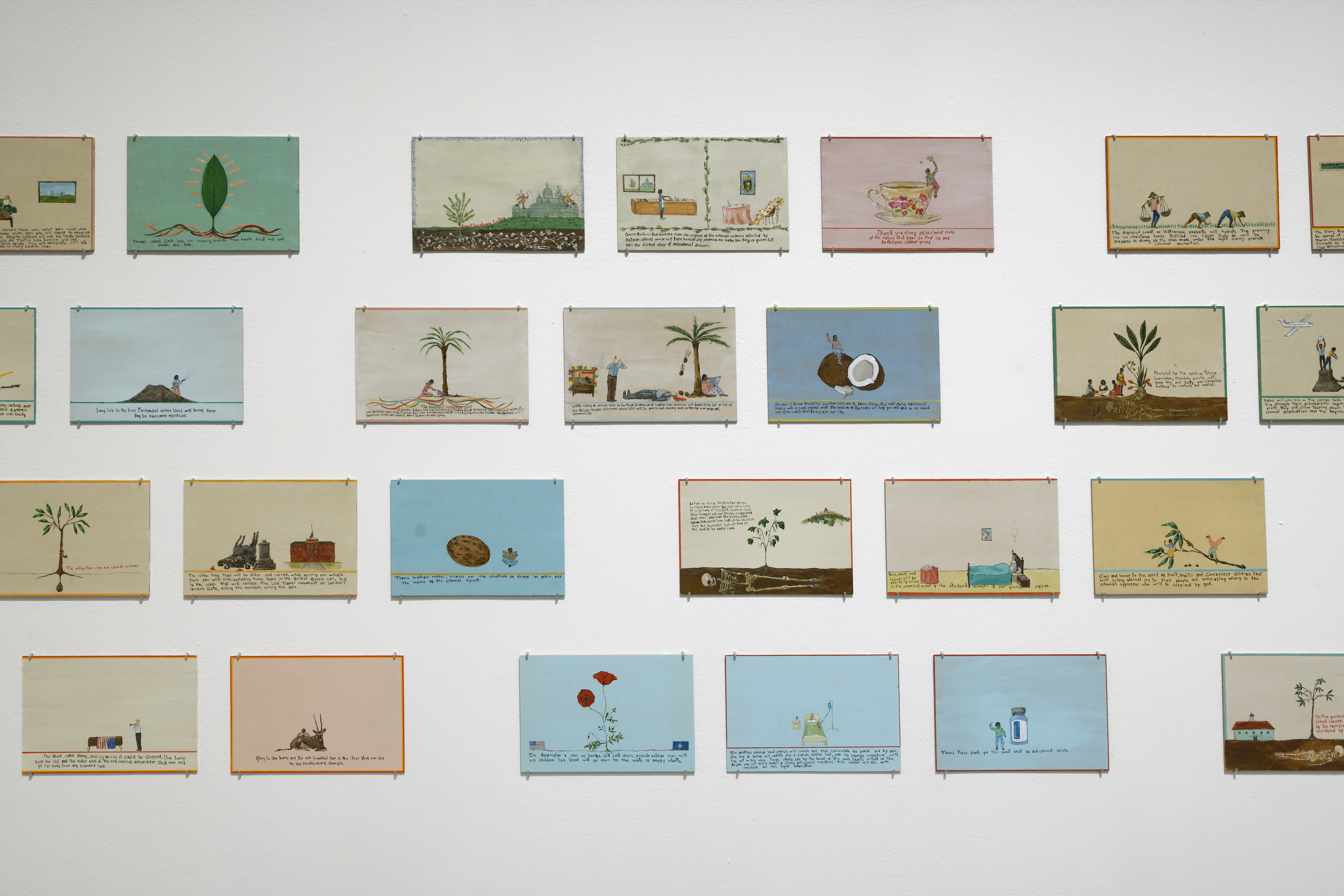 The humid intimacy of Calfuqueo’s screening room opened onto one of the cavernous and clinically bright gallery spaces for which the Palais de Tokyo is known. While it featured paralyzed vegetation from Abbas Akhavan and towering sculptures from Huma Bhabha, it was Peruvian artist Daniela Ortiz’s understated miniatures that held the room’s magnetic point of focus. Featuring nearly fifty paintings, Ortiz’s series The Rebellion of the Roots (2020−ongoing) dominated one gallery wall, pulling the viewer’s focus down to the scale of her postcard-like depictions. These scenes alternated between plants nourishing Indigenous people, Indigenous people nourishing plants, and plants assassinating white colonizers, with rainbow-colored strokes highlighting the central action in each work. Ortiz’s paintings are strikingly minimal, bright, and cartoonish; they were also the most politically direct pieces in the entire exhibition. Each painting has a hand-drawn datum line of text with proclamations like “FEU AU COLONIALISME DU JARDIN D’ACCLIMATATION,”2 “Thank you strong anticolonial roots of the roiboos that grew to find the end to Belgian violent greed,” or “While making an official visit to the Royal Greenhouse of Laeken four coconuts will beautifully fall on top of the Belgian Minister of Interior whose life will be gone for not causing more suffering over migrant communities.” The paintings are hopeful and militant, unapologetic in their desire for both joyful life and vengeful death.